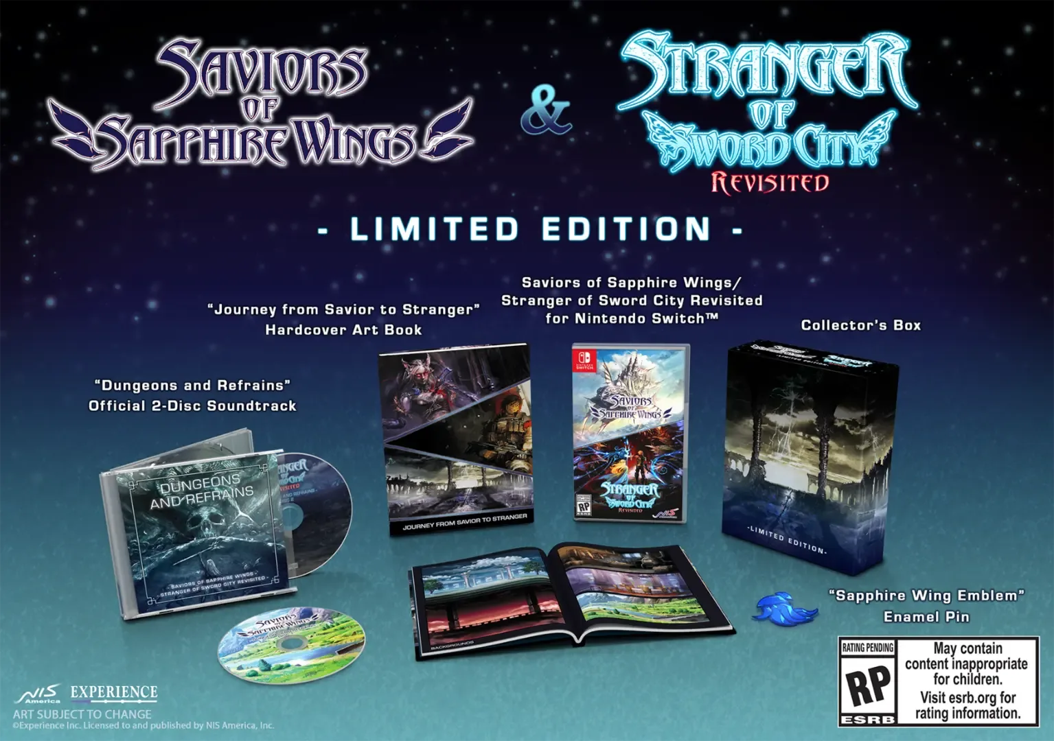 A physical limited edition of the game bundle for the Nintendo Switch. Includes: - Saviors of Sapphire Wings / Stranger of Sword City Revisited for Nintendo Switch - "Sapphire Wing Emblem" Enamel Pin - "Dungeons and Refrains" Official 2-Disc Soundtrack - "Journey from Savior to Stranger" Art Book - Collector's Box