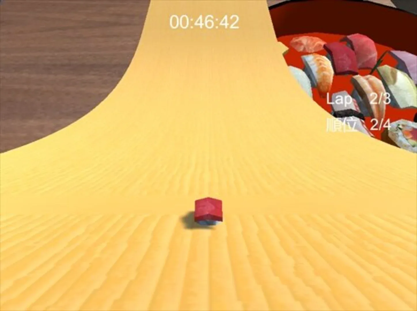 Kousoku Kaitenzushi ("High-Speed Turning Sushi") is a racing game featuring four courses and several different types of sushi for the player to control, each of which has their own distinct stats.