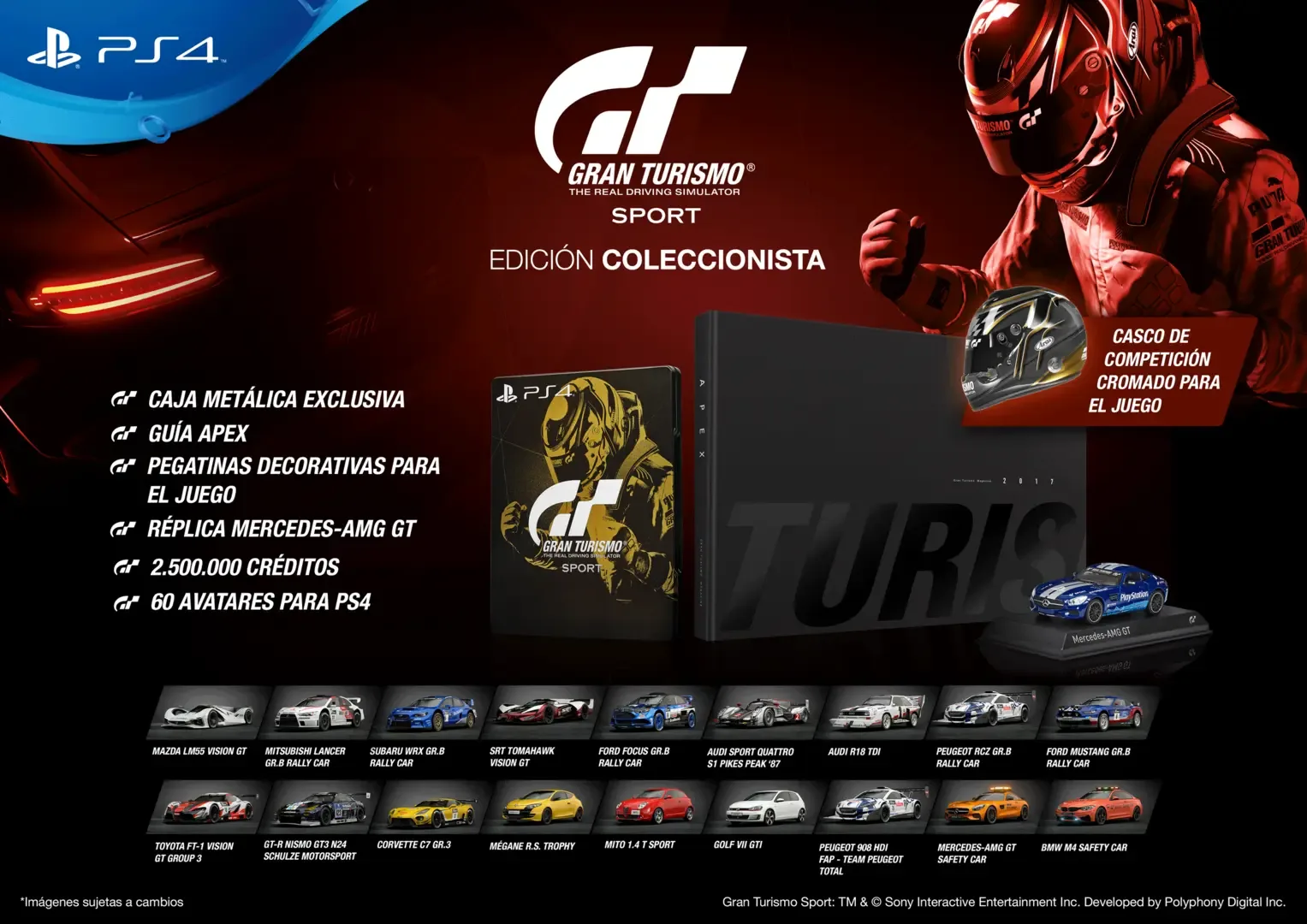 Collectors Edition Content: 18 Cars - Mazda LM55 Vision GT - Mitsubishi Lancer Gr.B Rally Car - Subaru WRX Gr.B Rally Car - SRT Tomahawk Vision GT - Ford Mustang Gr.B Rally Car - Ford Focus Gr.B Rally Car - Audi R18 TDI - Audi Sport Quattro S1 Pikes Peak ‘87 - Peugeot RCZ Gr.B Rally Car - Toyota FT-1 Vision GT Gr.3 - Nissan GT-R NISMO GT3 N24 Schulze Motorsport - Chevrolet Corvette C7 Gr.3 - Renault Mégane R.S. Trophy - Alfa Romeo MiTo 1.4 T Sport - Volkswagen Golf VII GTI - Peugeot 908 HDi FAP - Team Peugeot Total - Mercedes-AMG GT Safety Car - BMW M4 Safety Car APEX Booklet An A4 sized booklet introducing the history of Vision Gran Turismo cars, driving and set-up techniques, and a plethora of automotive history. This is a Gran Turismo to be read, packed with the essence of Gran Turismo Sport together with beautiful Scapes photos. Mercedes-AMG GT Model A 1/43 die-cast model of the Mercedes-AMG GT. Livery Stickers A sticker pack that can be used in the Livery Editor of the game. In-Game Credit (Cr. 2,500,000) In-game currency that can be used for various purchases in the game. 60 PS4 Avatars A set of 60 'Gran Turismo Sport' original avatars that can be used with your PlayStation4 profile. Racing Helmet - Chrome Special chromed helmet that can be used in-game.