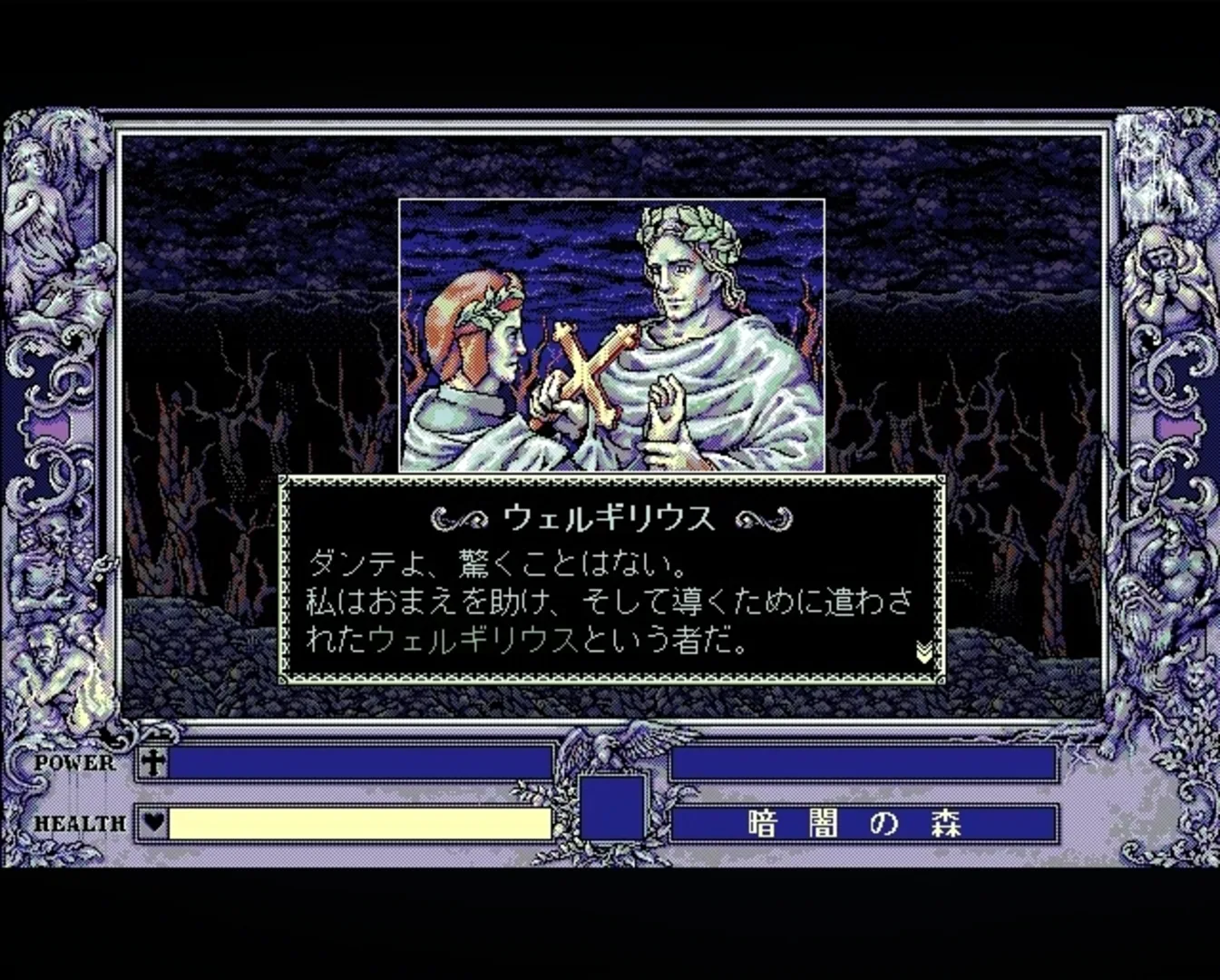 Tamashii no Mon Dante no Shinkyoku yori is a side-scrolling adventure game with platforming elements. The game's events are a distilled portrayal of the Divine Comedy, an epic poem created by Dante Alighieri depicting his journey through the nine circles of Hell to reunite with his childhood love, Beatrice.