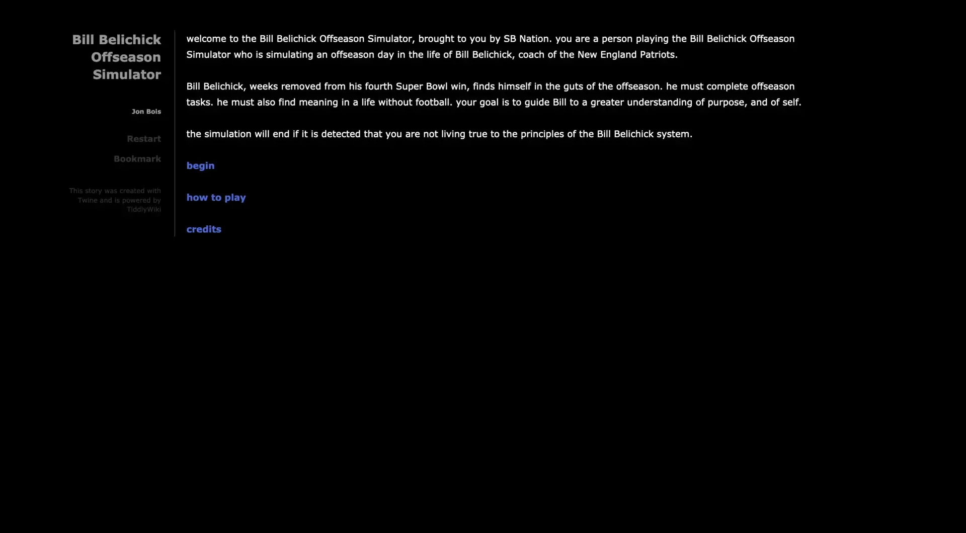 This must be emphasized from the outset: The Bill Belichick Offseason Simulator is a tool, and not a toy. It does not exist to amuse you. It is meant to train prospective football coaches in the art and science of managing the travails of the offseason. Any fun you may have, or amusement you may find, while piloting this simulator is purely accidental, and should be reported as a software bug. This "video game," if you would like to call it that, is not about fun and games. It is about getting dressed, resetting the clock on your car radio, shopping at the hardware store, and accomplishing offseason tasks. In other words, it is the exact sort of game Bill Belichick might himself make. This game is possible to beat, but you may find it frustrating and difficult at times. That is because you are not Bill Belichick.