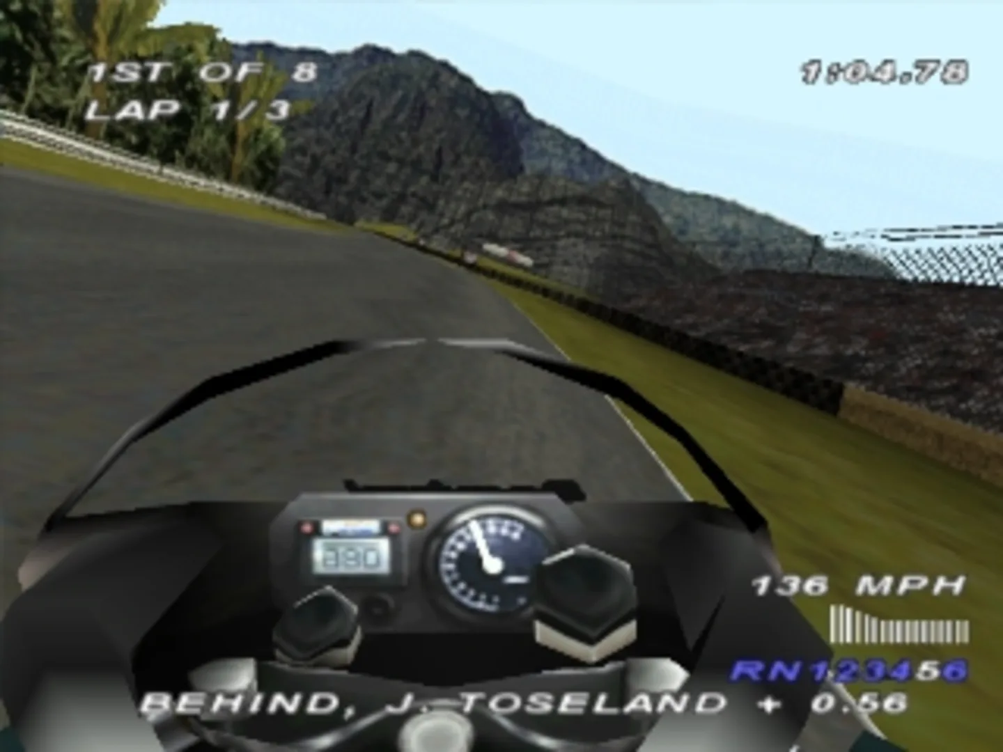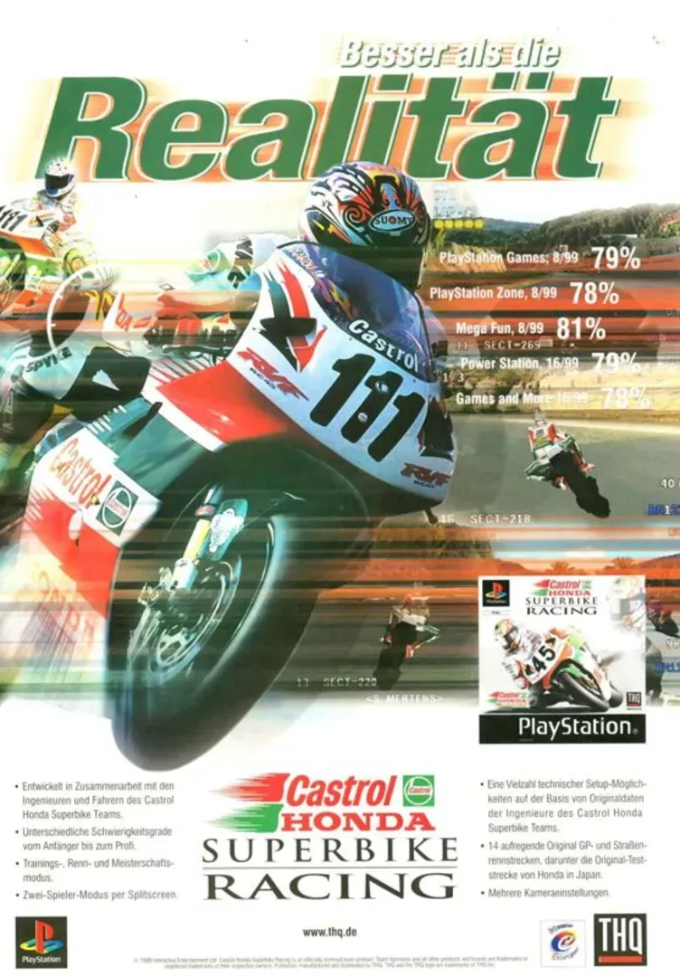 Castrol Honda Superbike Racing is a motorcycling game. The player can choose between four playing modes: practice session (just racing alone on a track), trainer session (following another bike to learn the ideal line), single race or championship (one season over all 14 courses). The two latter ones optionally also include a qualifying session. While there is only one bike (Honda RC 45). it is possible to change its setup (gearbox, front tire, rear tire, final drive, gears). Single races and championship can also be played with a second player in split-screen. The races include overall eight participants. Besides the eight difficulty levels and number of laps, the player can also enable/disable auto brake, help arrows, steering assist, wheelies, engine overheat, tire wear, loose rear wheel, penalties, bike damage and major damage. This game is in part based on Castrol Honda Superbike 2000.