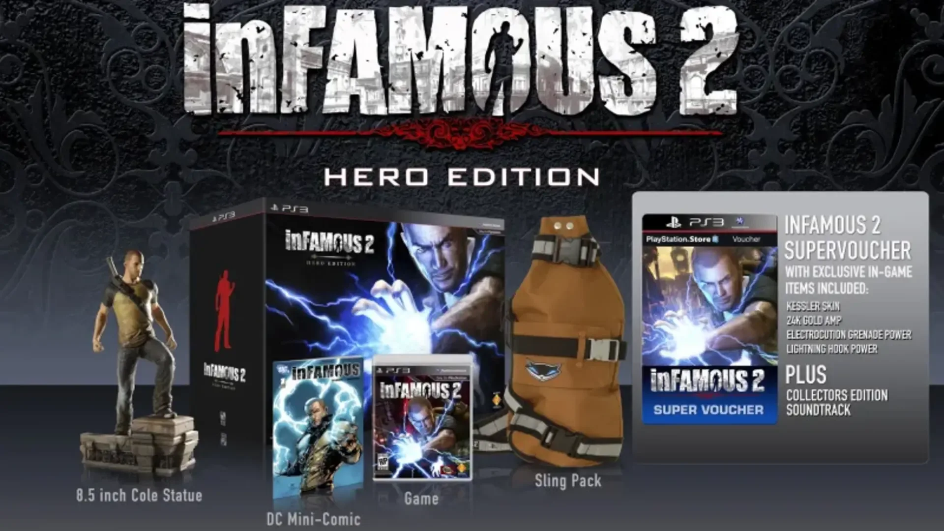 A special edition dubbed the Hero Edition was announced on February 18 of 2011, and was made available for pre-order. The Hero Edition included: - A miniature statuette of Cole MacGrath in his neutral state - A wearable replica of Cole's sling bag - The first issue of the Infamous DC Comics - A voucher to download the game's soundtrack - A voucher for in-game bonus content, including: -- The Kessler and Reaper skin -- The Sly Cane, Samurai Sword, Caveman Club, and 24 Karat Gold Amp skins -- Two exclusive powers: the Lightning Hook and the Electrocution Grenade powers.