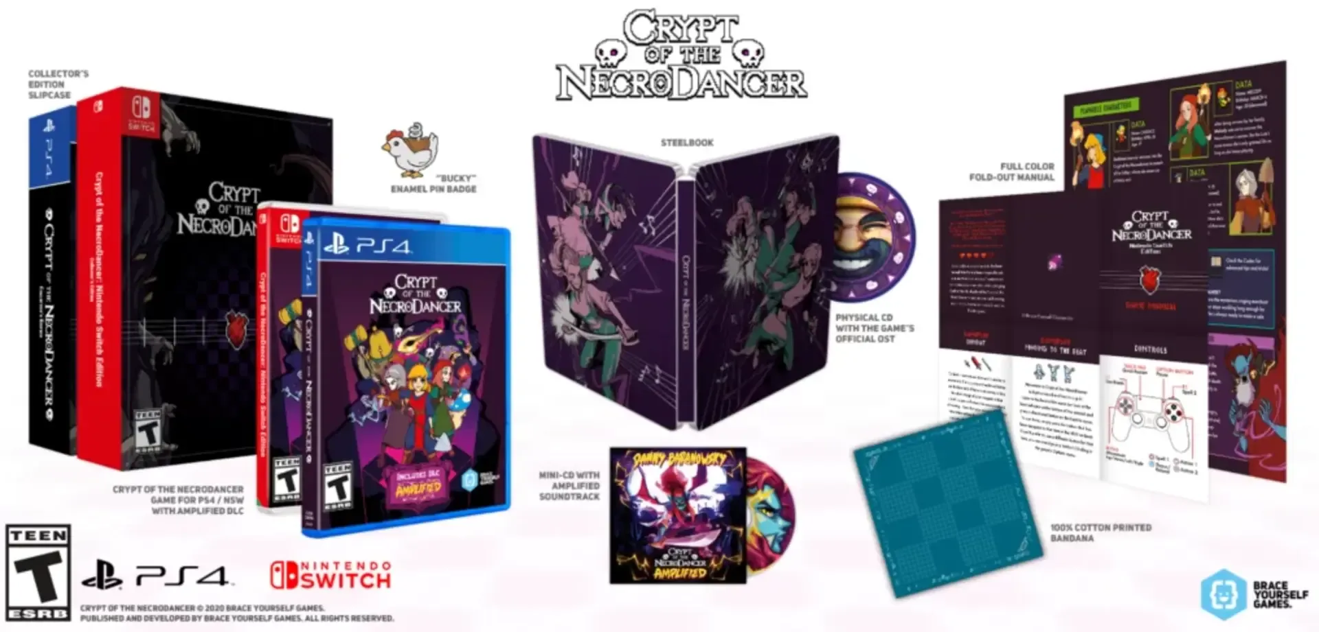 This edition includes the following: - Crypt of the NecroDancer - Illustrated steelbook case - Full-color manual - Exclusive 100% cotton printed “Cadence” bandana - Enamel pin of “Bucky” - An unused pet familiar by original NecroDancer artist, Jesse Turner - Mini-CD of the original NecroDancer and “AMPLIFIED” DLC OSTs, with music by Danny Baranowsky feat. FamilyJules and guest artists, and art by the talented Anailis Dorta.