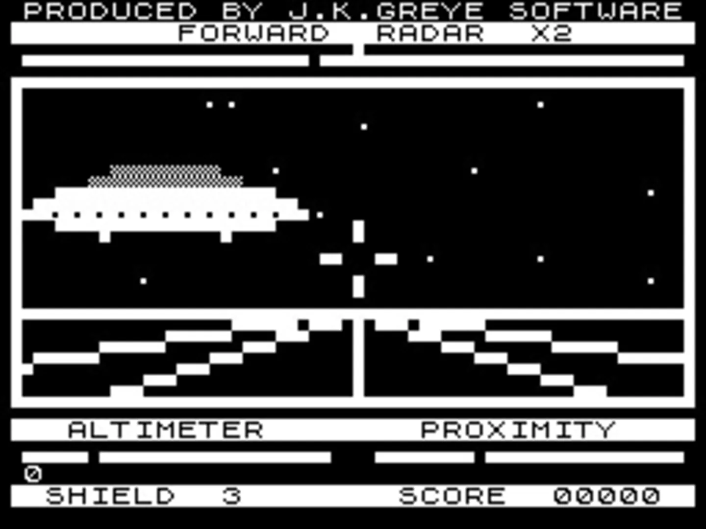 The classic Defenders (Atari 2600 and other platforms) but then in a first person 3D perspective. This game is to be run with a 16K expansion module. You fly over a planet and have a proximity radar indicating where (left-right) an enemy is. Your radar can show false hits when meteorites fall down. The enemies go down and you get points (250) if you shoot them before they reach the ground. The enemies will shoot at you and you will have to try to prevent being hit. If an enemy reaches the ground and can fly up and away again you loose points (50). You have a shield which can take take 10 hits. With either one of the keys q-t moves you left-down. y-p right-down. a-g left-up, h-newline right up. z-m shoots the laser. Using two keys at once allows you to move non-diagonal.
