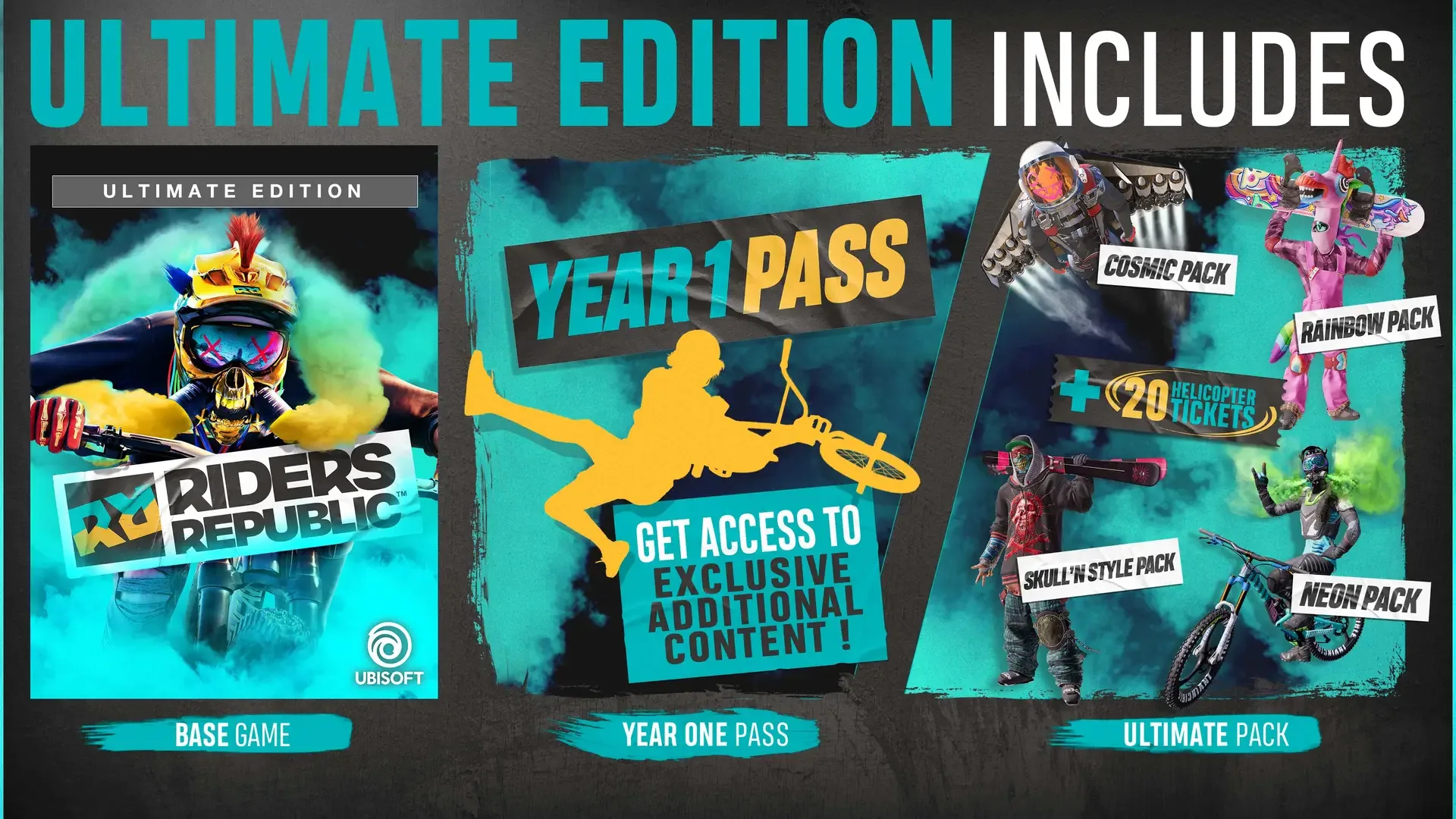 Jump into the Riders Republic massive multiplayer playground! Bike, ski, snowboard, or wingsuit across an open world sports paradise. Ultimate Edition includes the Year 1 Pass and four exclusive cosmetic packs: Cosmic, Rainbow, Neon, and Skull'n Style Packs. Grab your bike, skis, snowboard, or wingsuit and explore an open world sports paradise where the rules are yours to make - or break.