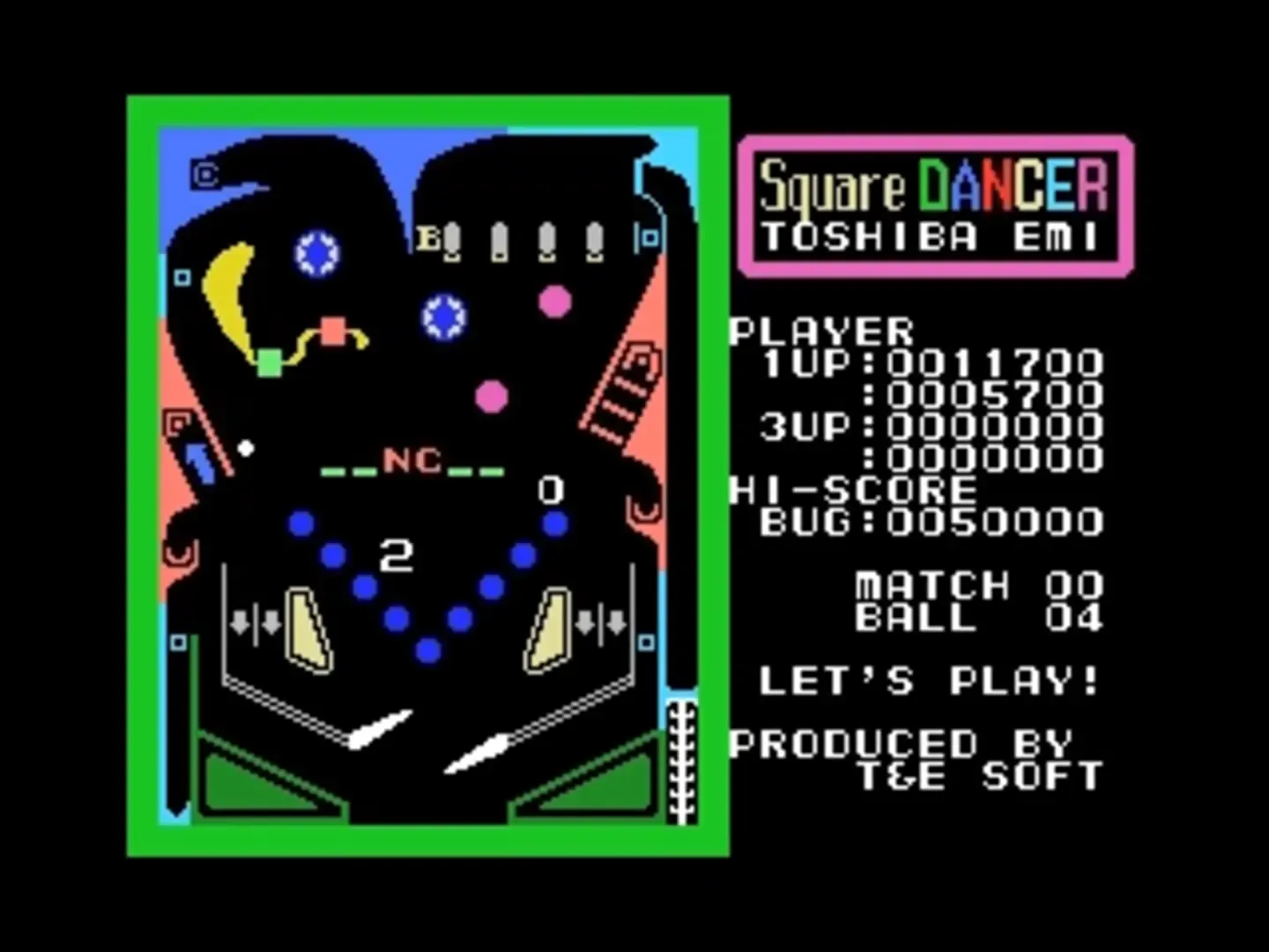 Square Dancer is a basic pinball simulation for MSX. The player controls the left and right paddle individually, and attempts to keep the pinball in play for as long as possible with the goal to maximize score.