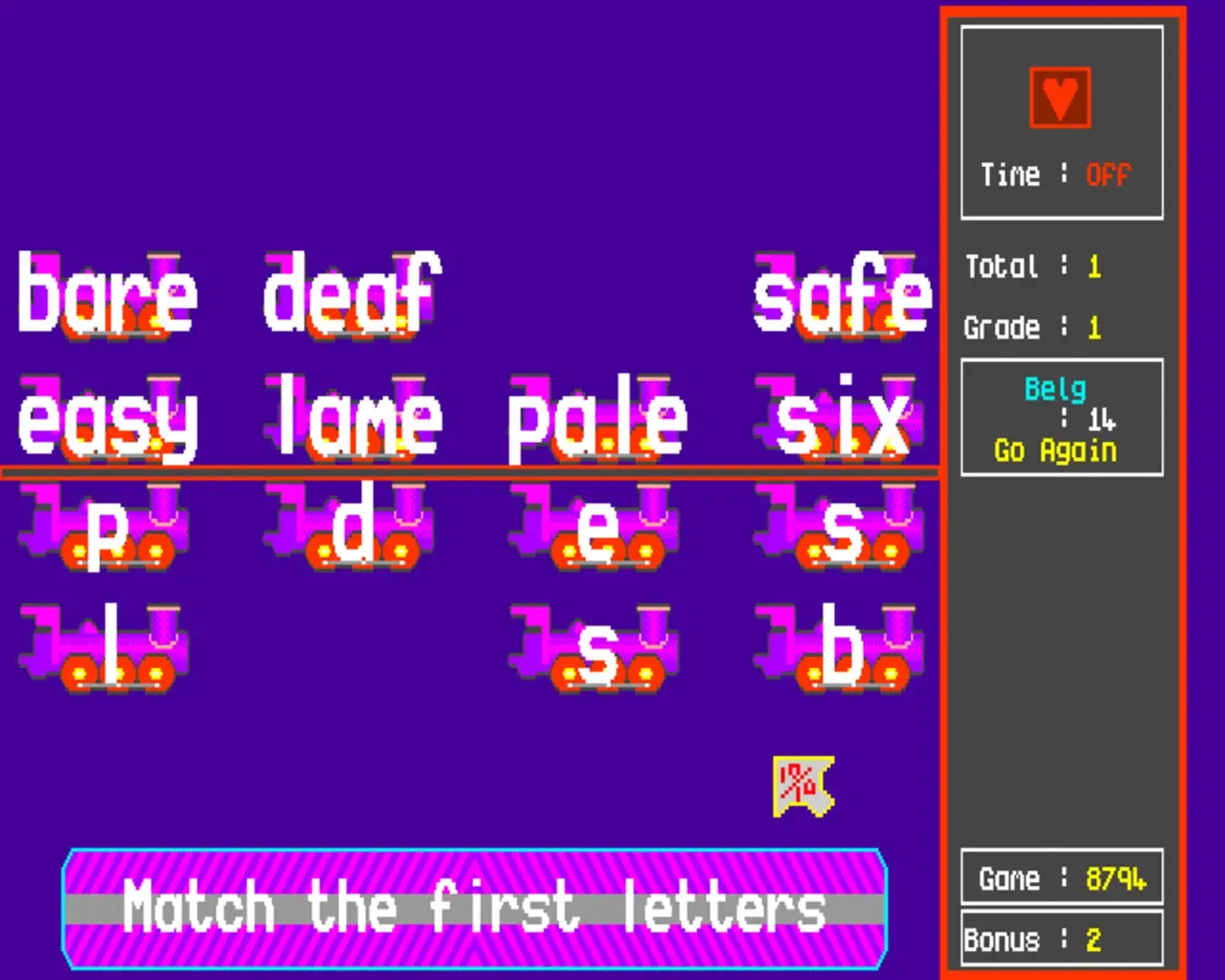 Children's educational game designed to teach the user English skills such as, spelling. The games consists of six mini-games. The player is given a grade after completing each game, Pathetic being the worst, Genius being the top level. The games are: Sniper, Cover Up, Word Fit, Grab It!, Librarian and Cheers.
