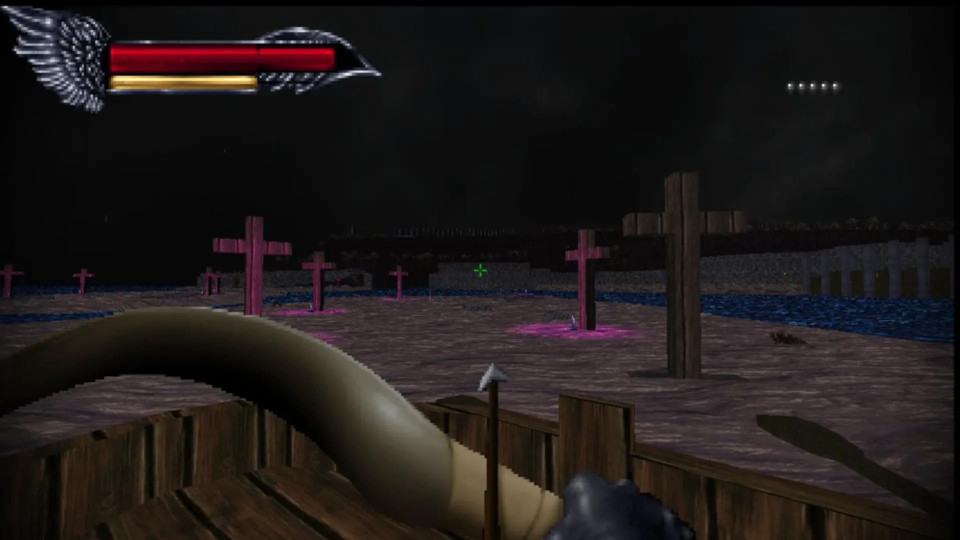 Nocturne in Yellow is a fantasy medieval first-person shooter using an extremely modified version of the idtech1 engine, also known as the Doom engine. In it, you play as a dude marching through ancient castles with the realization that every myth and story ever made in the history of man is true and all of them are pissed off at you for having a pulse and four functional limbs. You utilize a bow, some grenades, and a spear in order to fend them off, wandering deeper to stop the rise of the dark lord threatening to spread death, destruction, and hurt feelings all around. Being a first-person shooter, you step into the eyes of a protagonist and wield whatever weapon he was smart enough to grab before wandering off on this death quest. Primary fire, well, fires whatever weapon you're using, while secondary fire lobs a grenade at whatever looks funny at you. Run around through seven maps, picking up items and stabbing dudes before reaching a boss at the end, and then stab the boss. Boss drops artifact, pick up artifact for more powers for your bow, and then move on to the next level to repeat as needed. After you do this seven times, you win! If you play on Story Mode, occasionally there will be long walls of text about people talking about their feelings. If you play on Arcade mode, all of the boring text will be stripped out, leaving you free to stab enemies without hearing about their failed love life.
