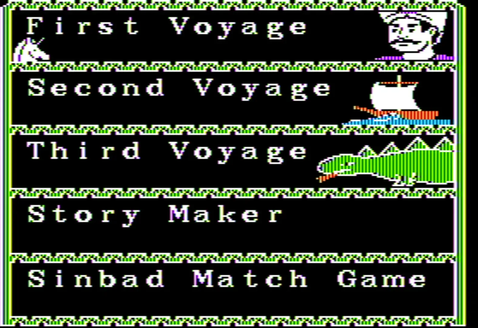 The Adventures of Sinbad is an educational reading program with a tile matching game. It contains several short stories about the Sinbad the Sailor with corresponding reading comprehension questions. Additionally, there is a tile matching game for one or two players. Players take turns guessing two tiles from a 4x4 grid, with pictures from Sinbad's adventures. The player who achieves the most matches is the winner.