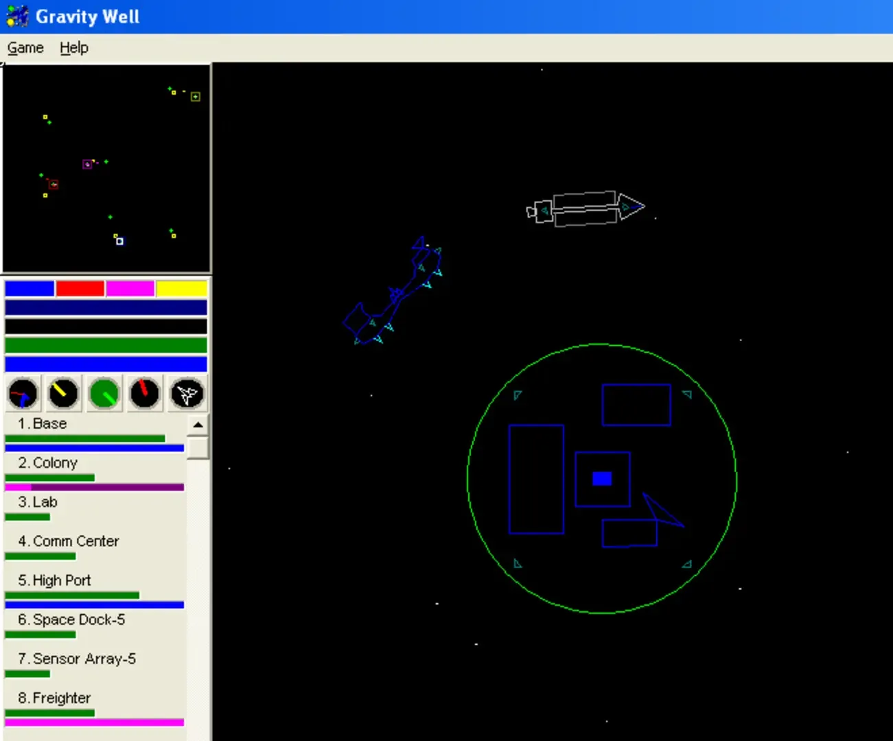 Gravity Well is a fast paced game of planetary conquest for Windows. It's a strategic war game that's played like an arcade game. The game represents a simple interstellar economy that supports the discovery and conquest of new worlds. The player's role is to scout new planets and establish landing sites for the colonization ships that follow. Once a landing site is established, freighters are dispatched to begin construction of a base and colony complex. However, there are others with the same designs on this sector of space and the player must be prepared to fight for every stinking dirtball.