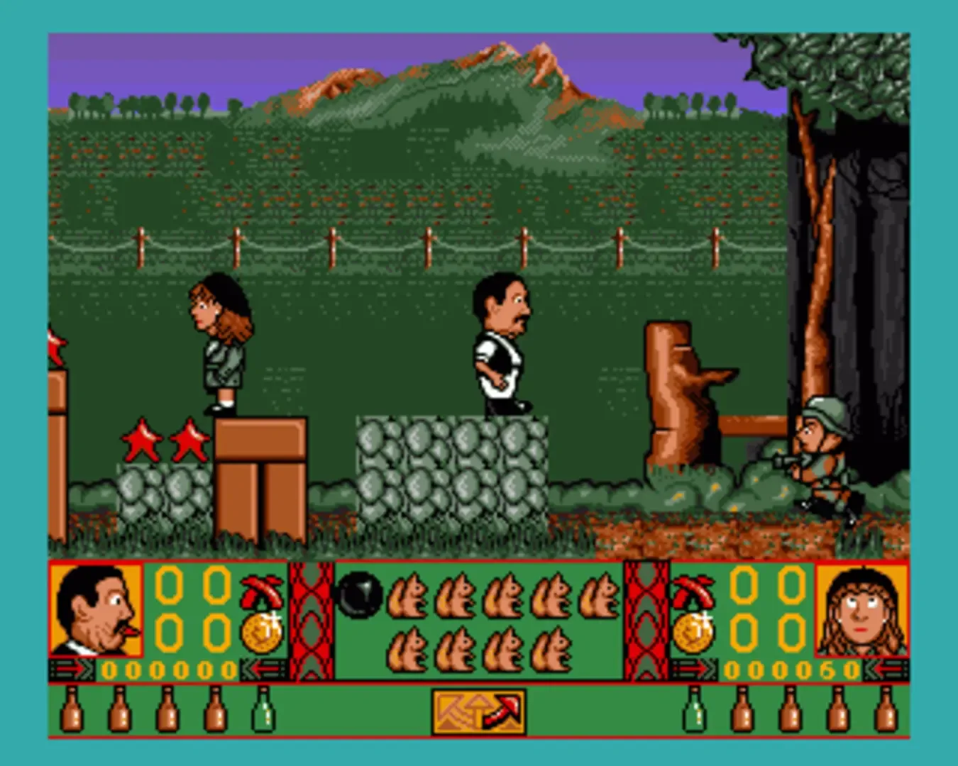 'Allo 'Allo is based on the long-running BBC TV comedy series set in occupied France in World War II. From the back of the box: This is without doubt one of the best platform arcade romps to come to your computer. Packed with madcap humour, action and addictive gameplay. Huge multilevels! Full 360 Multi-directional scrolling! Over 900K of stereo music and sound effects! The most spacious sound around! Fully animated backgrounds some with 8 layers of parallax! 1 or 2 players (2 player option has simultaneous gameplay) Difference game variations for 1 or 2 player options Lots and lots of cartoon characters each with their own humorous styles Well over 1 meg. of stunning graphics So come on! Join our heroes on their quest to find both fake and genuine lost art treasures in this wacky cartoon caper!