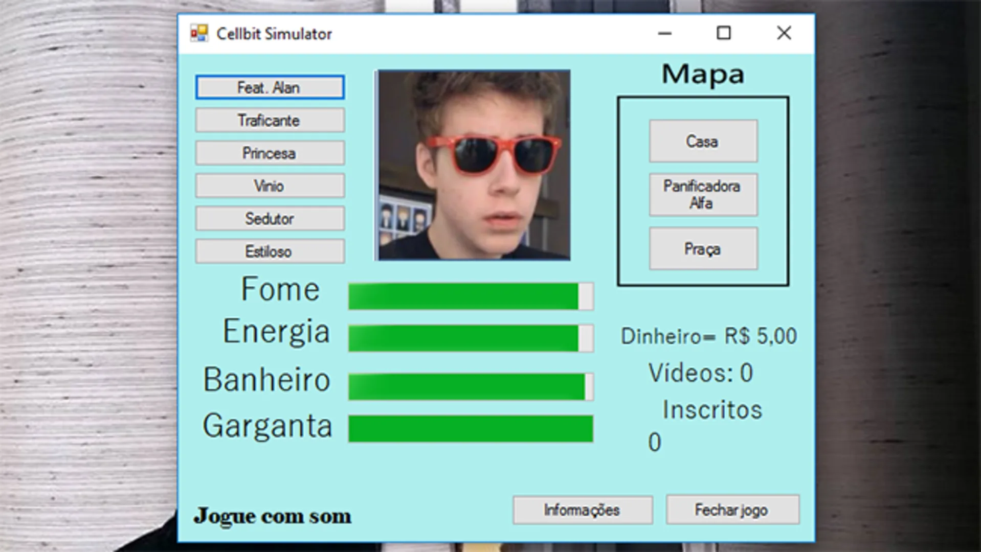 This game is a Cellbit simulator based on the "Life Simulator" game. In it you are the Cellbit and your goal is to become the LARGEST YOUTUBER IN THE WORLD (getting more subscribers than the PewDiePie). Hope you like it. As this is my first game and I never programmed it before, the game may be a little bad and with bugs, I ask you to leave comments saying if you liked it or not and what can improve.