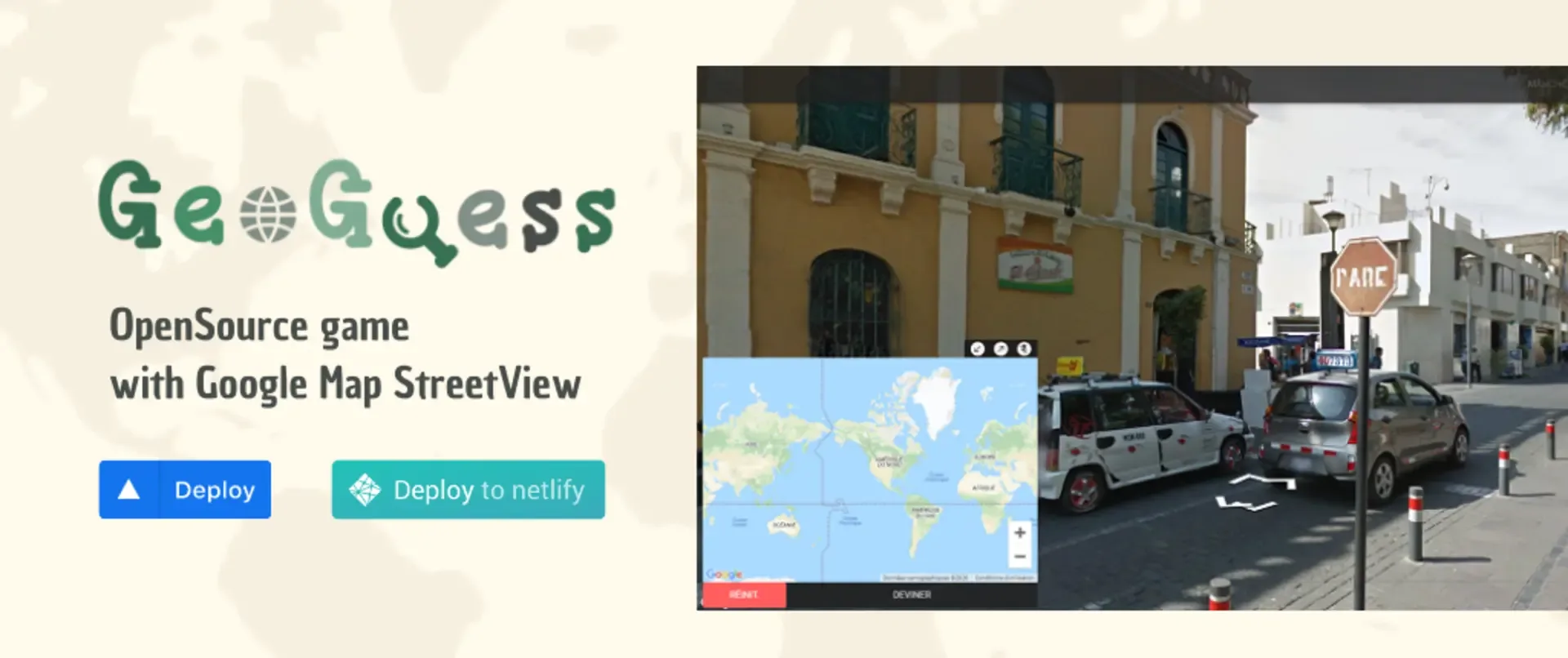 Geoguess is a free OpenSource game with Google Map StreetView inspired by GeoGuessr. When you start a round, you are teleport to a random position on Google Street View. Move and observe the vicinity. Try to guess where you are.