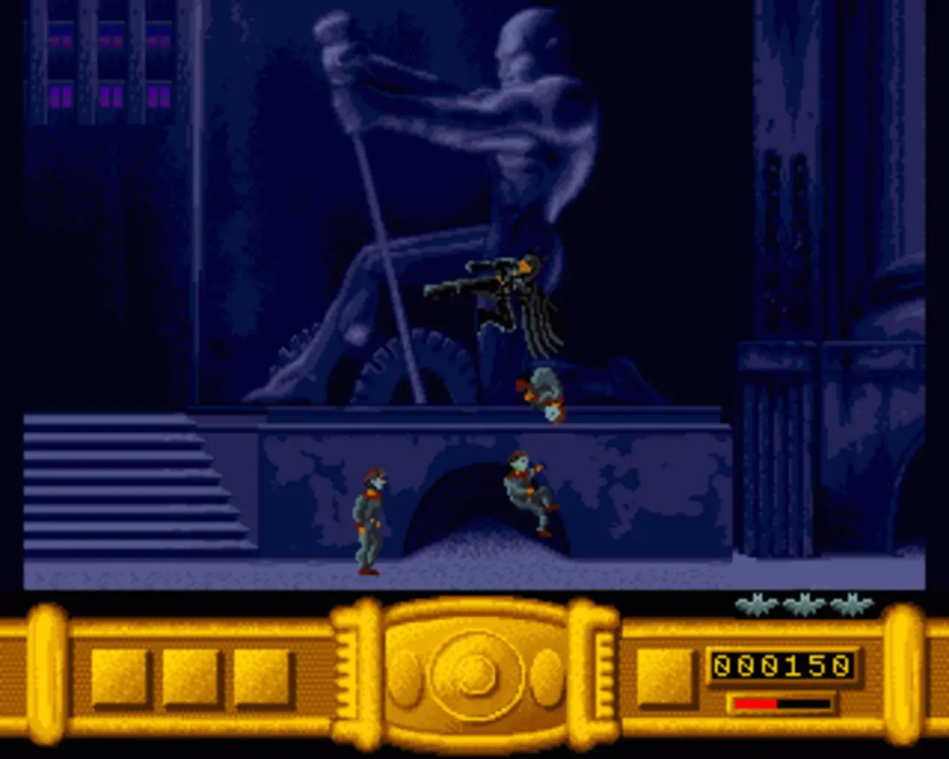 A side-scrolling platform game based very loosely around the second Batman movie. Penguin's army of killer clowns threaten to take control over Gotham City. The only thing standing in their way is Batman.