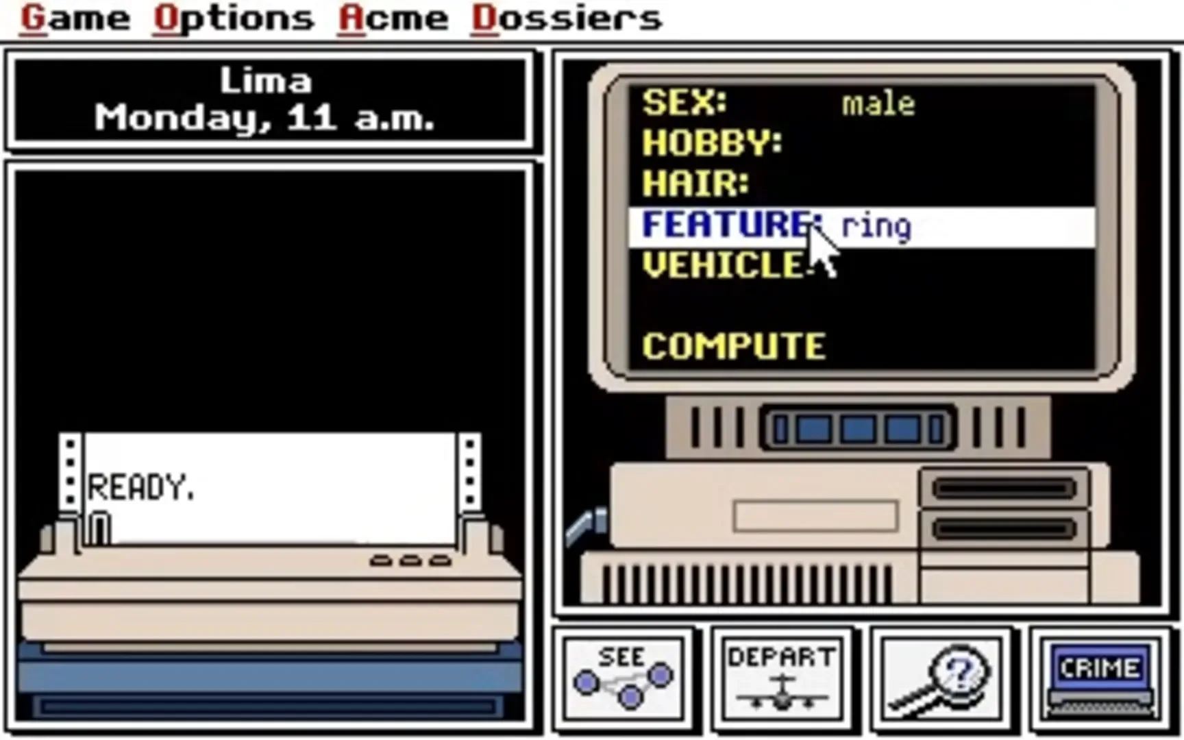 In pursuing the notorious Carmen Sandiego, you start out as a rookie detective whose job is to track down a sudden crop of thieves stealing the world's most precious treasures. After a quick print out of your assignment, you'll be given a deadline to capture the thief that stole the artifact using clues dealing with your knowledge of geography. Where in the world is Carmen Sandiego? Enhanced edition features spiffy VGA graphics, good sound effects, joystick support, and a convenient menu bar that's static even in-game. There's also the usual Hall of Fame, Detective Roster, and a Dossier profiling 10 suspects. If you're into edutainment with as little fuss as possible, Where in the world is Carmen Sandiego? is just the game you've been looking for and more. You may, in fact, be playing numerous games after arresting Carmen because it's different each time you play.