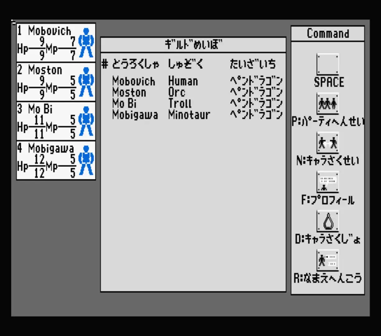 Phantasie IV: The Birth of Heroes is the fourth entry in the RPG series Phantasie, and the only one that was released exclusively for Japanese computers. Gameplay-wise and visually, the game is very similar to the previous installments. The player creates a party of adventurers (up to six active combatants, including the series' trademark "random creatures", such as ogres, minotaurs, lizardmen, etc.), which then roams the top-down world-map, descending into dungeons, and fighting randomly appearing enemies in turn-based combat. Battles allow specific commands such as "Thrust", "Parry", "Throw", etc., and - similarly to the third game - placement of the characters in rows on the battle screen.
