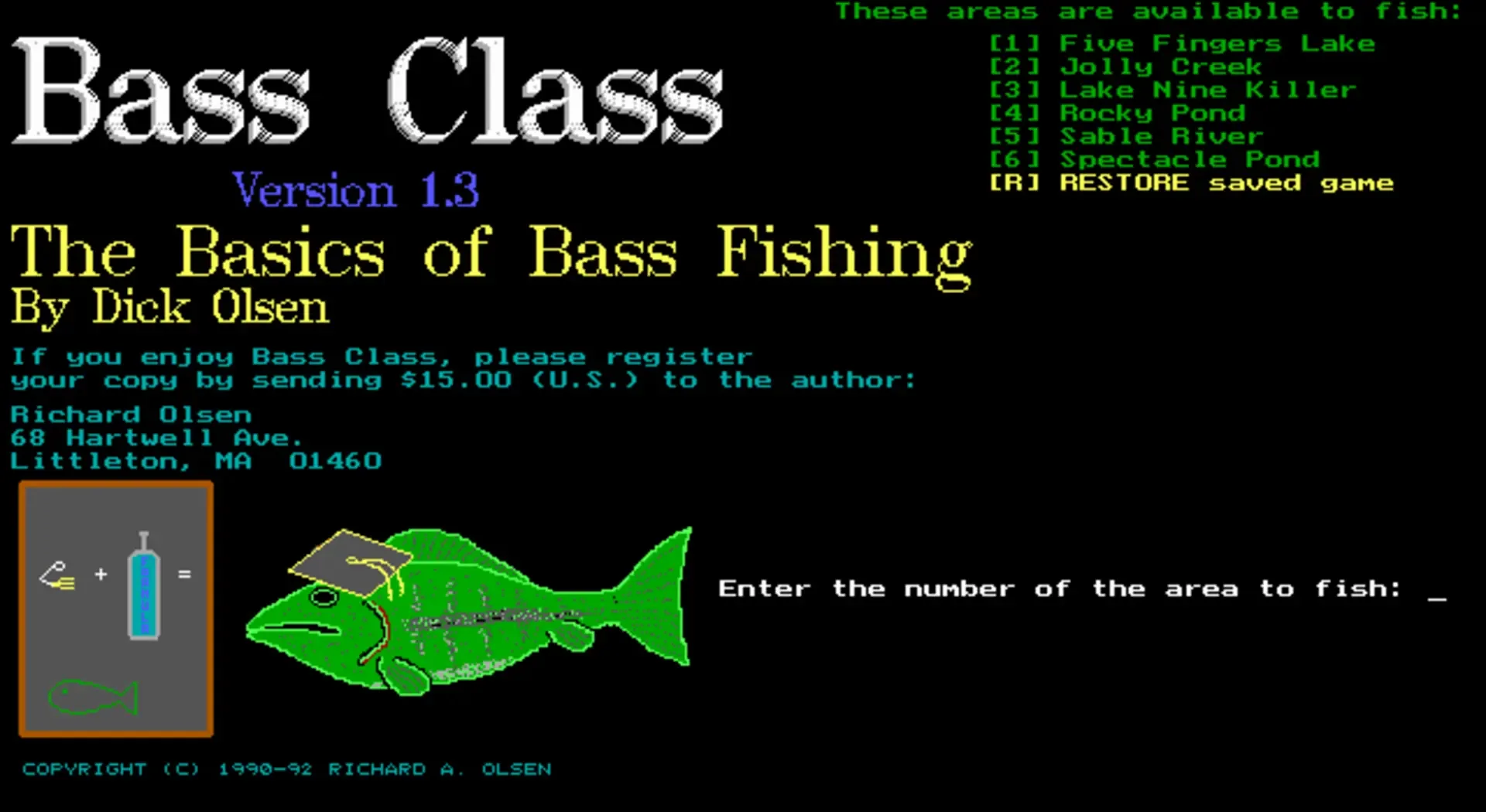 Learn the secrets of bass fishing by casting off with Bass Class. In this simulation you will select all the small details that will determine whether you catch the big one or go home empty handed. Six different rods and 2300 different lure combinations are how specific the details get. You can even choose whether you want to use an outboard motor, trolling motor or paddling to get to where you want on one of the six different lakes in this game. Once in your location of choice via keyboard controls make your lure/rod selections and cast off using the mouse or keyboard watching out for hazards. Control your line and reel in and maybe you'll catch one of the dozens of different kinds of fish in each lake. LCD Depthfinders and other accessories will help you locate the best place to cast off. After fishing in the given time you must make it back to the weighing station and get your catch weighed against the AI players' catch. Only then will you know if you've learned anything about bass fishing.