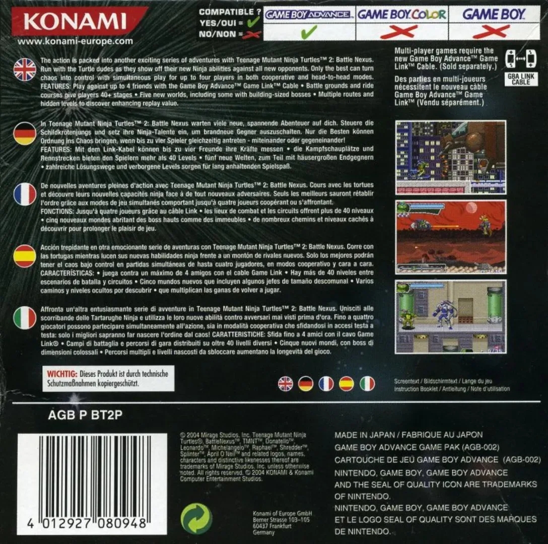 Teenage Mutant Ninja Turtles 2: Battle Nexus was released for the Game Boy Advance; which is 2D platformer, opposed to it's concurrently released variation for PS2, GameCube and Xbox that is a third person beat 'em up. It released in 2004 by Konami and was the sequel to Teenage Mutant Ninja Turtles and based on the 2003 TV series.