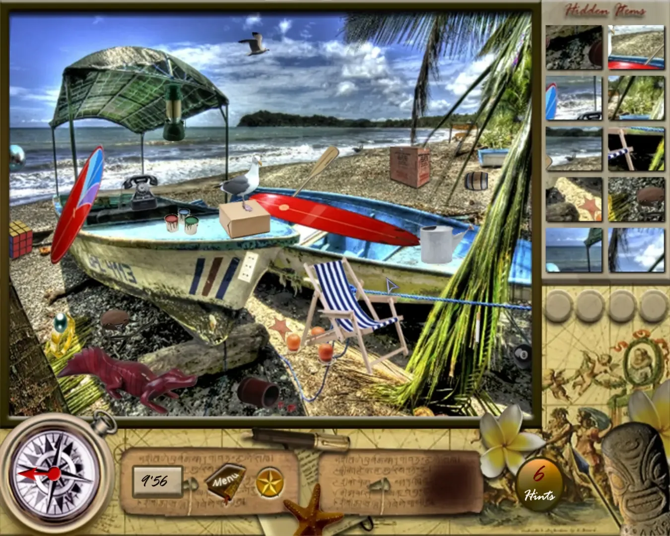 Tahiti Hidden Pearls is a hidden object game. As usual, the goal is to find and click on all the items from a list at the right side of the screen, on cluttered locations around the Tahiti island, within a time limit. Besides the list items, each location has four hidden pearls. After collecting them, the player receives one extra hint. The hint button highlights the position of one of the required objects. Mini-games appear between stages, where the player has to find the differences between two similar images, assemble jigsaw puzzles and solve similar challenges.