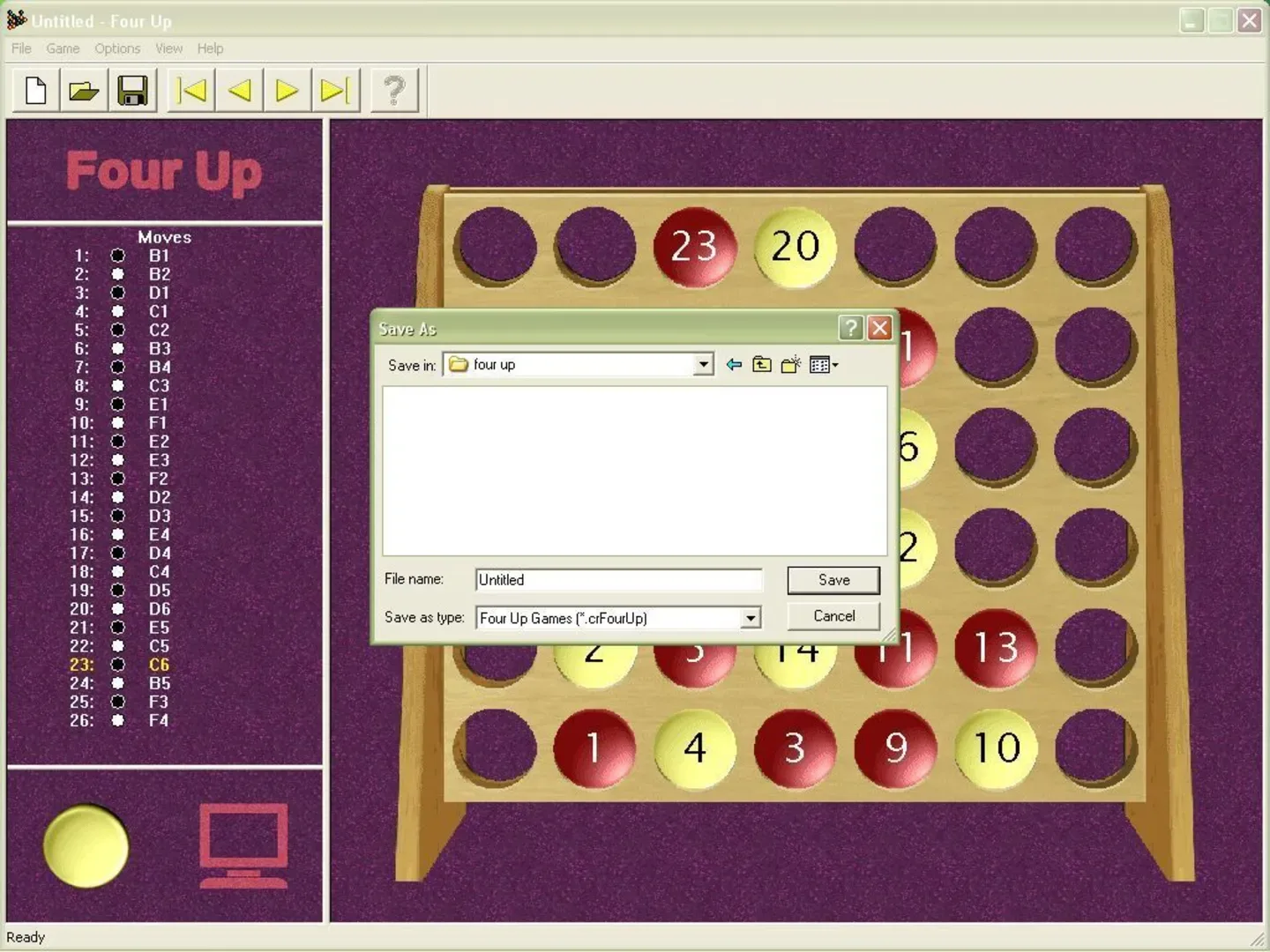 Four Up is a version of the board/tile game 'Connect Four'. It is played either by one person vs the computer on one of four skill settings or between two human players. The game is played entirely with the mouse in one of three predefined resolutions. It has a help file that opens in a separate browser window and a savegame and replay features.