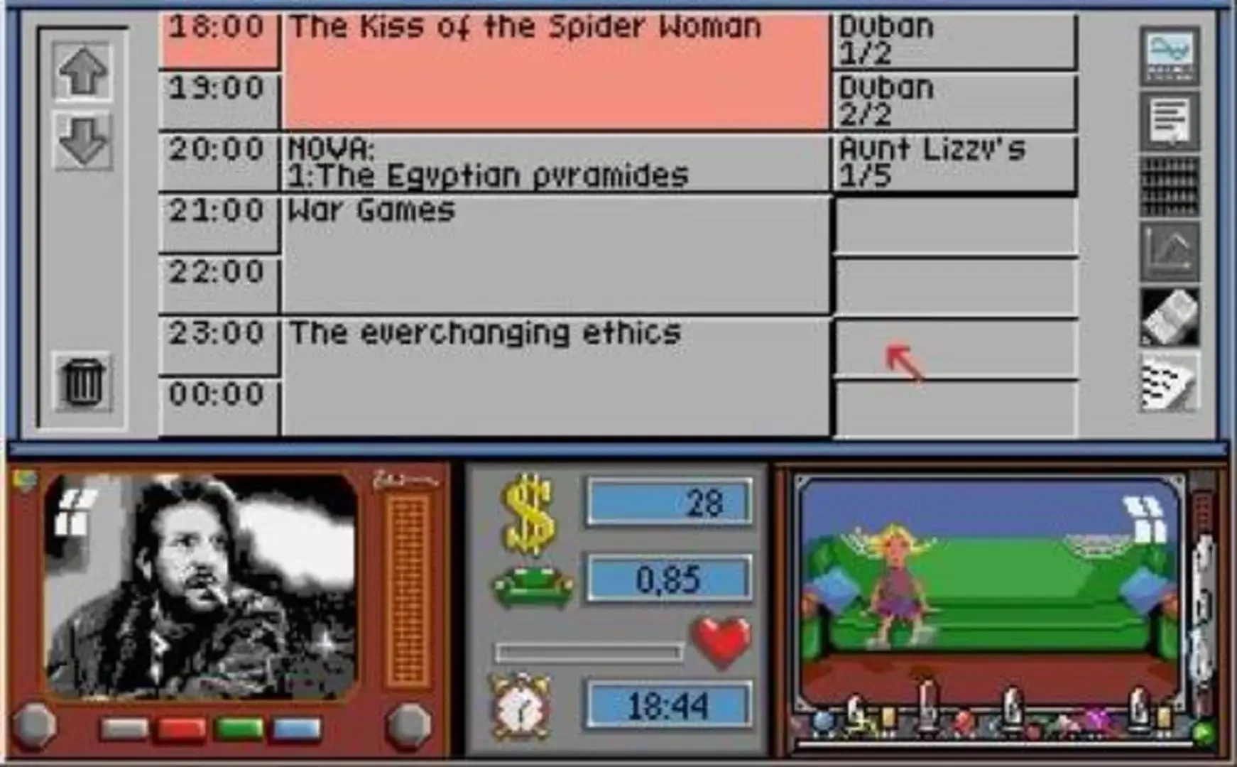 Mad TV is a television station management simulation computer game produced in 1991 by Rainbow Arts. It is loosely based on Mad Magazine, and the game's introduction animation features the magazine's mascot, Alfred E. Neuman, smiling on a television. The game puts the player in the role of a new program director for a TV station. The player is in charge of selecting programming and earning advertising for the station, while simultaneously trying to marry Betty, an attractive woman working in the building.