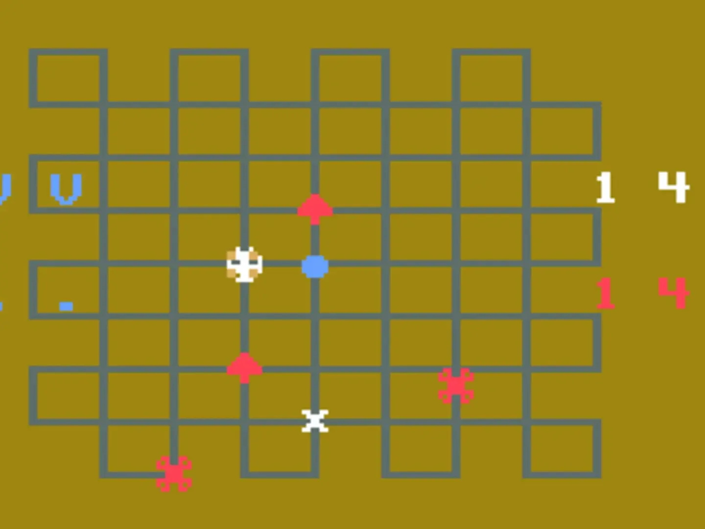 Two titles are available in this cart: - Mission Impossible is an action game. The player must protect a cargo ship (white craft) which travels on a lay lines from bounty hunters (red crafts), which will destroy the cargo ship if they cross its way. As the cargo ship moves along the lay lines, the player must place NGR bots (green X symbols) at the lay line intersections to change traffic; the player has 7 NGR bots and can replace them. When any ships reaches an NGR bot, it will turn right if traveling vertically or turn toward the bottom of the screen when traveling horizontally. Red mushroom-shaped power ups, when picked up allow the cargo ship to destroy the bounty hunters; alternatively, bounty hunters can be simply directed to them and will be destroyed. White X marks will send the cargo ship back in the opposite way it was traveling; if hit by a bounty hunter, they will also send them back, but will be destroyed. Lilac squares are mines which will destroy any ship that passes over them. Finally, blue dots will give bounty hunters an extra life if taken by them. The player and the bounty hunters start with 15 lives each, the first to drop to zero loses. - Programmed Trip is a turn based game which shares many elements from the previous game. As the name implies, the player has to program the trip of the cargo field so it passes over pickup points (colored + symbols) in a specific order: first lilac, then red, then blue. To do so, NGR bots can be placed to redirect the ship, and some fields may also have White X marks already placed. After all desired NGR bots are placed, the player can release the cargo ship by placing the cursor over the upper left corner and pressing the action button. When the cargo ship is released the player has 30 points. Passing over pickup points in the correct order adds 20 points to the score, while passing over them in the wrong order or hitting any other item (NGR bots or white X marks, for instance) subtracts 10 points from the score. The game is over either when the score reaches 0 or when all pickup points were reached in the right order (in which case they'll turn white).