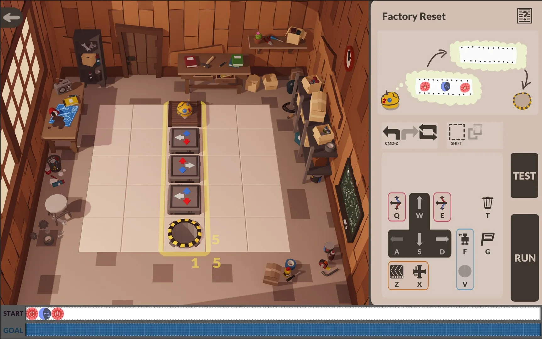 Manufactoria 2022 is a constructive puzzle game about pushing robots around.