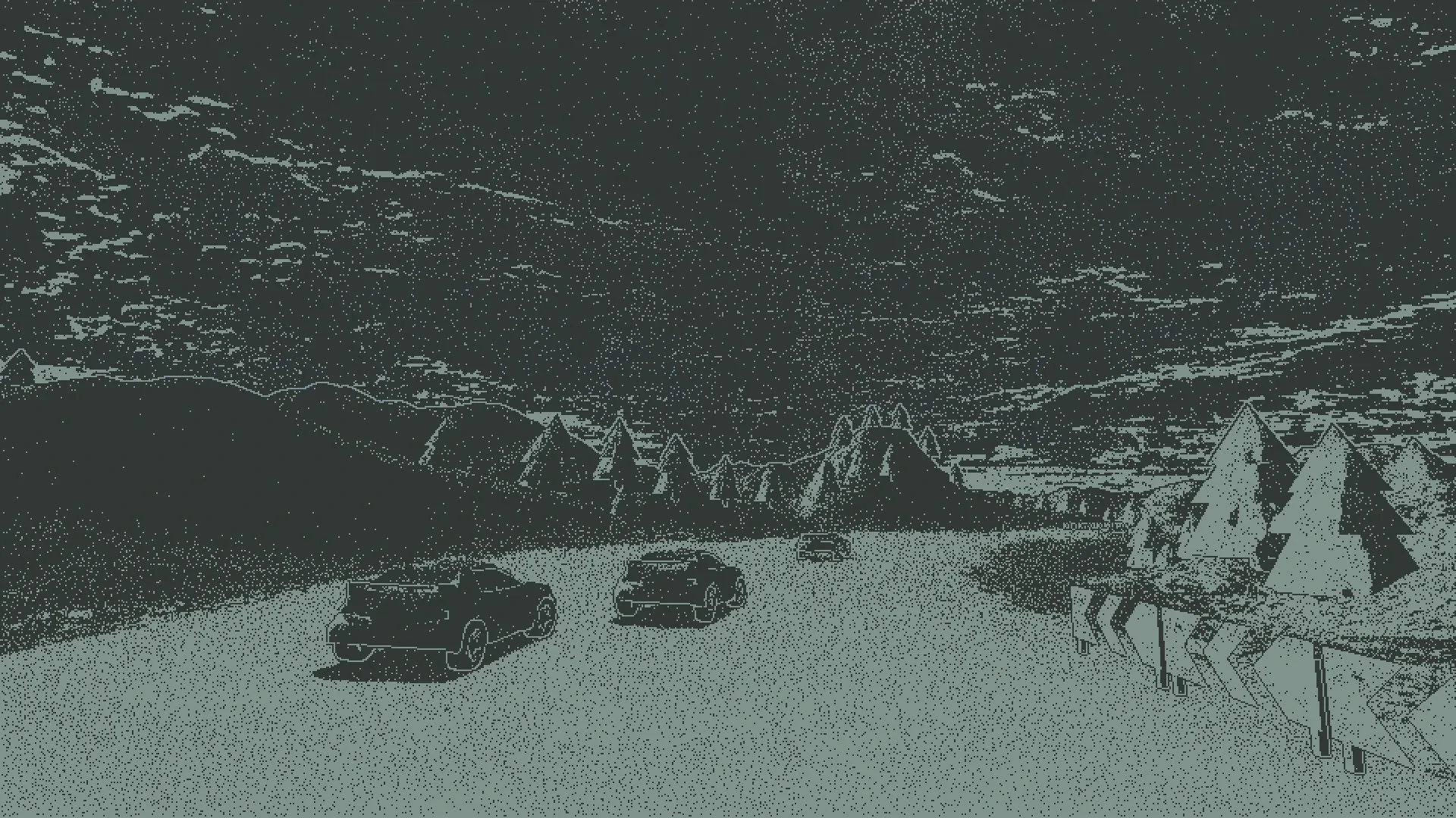 Indie racing features on-the-fly generated challenges, fake car physics for fun casual playing and custom 1-bit 3D pixel-perfect dithering visual style.