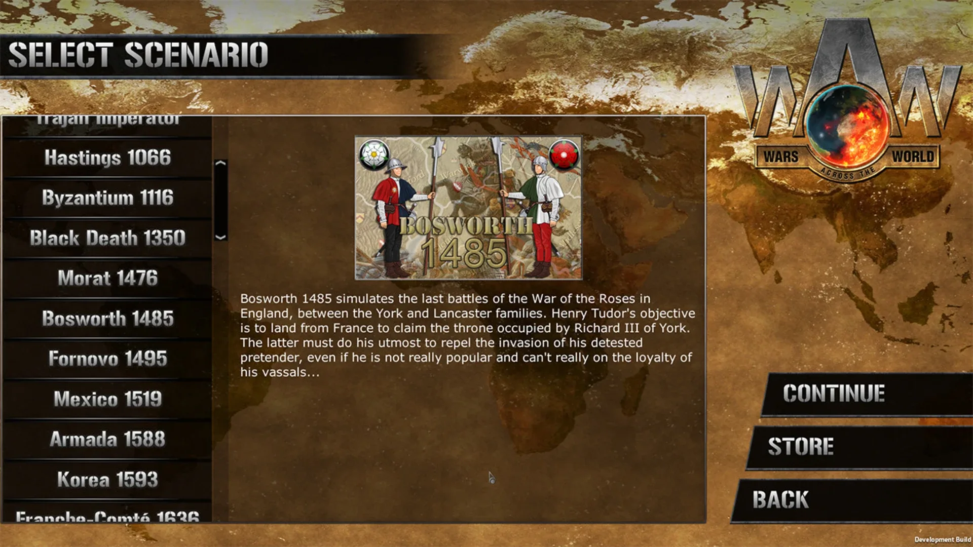 Bosworth 1485 simulates the last battles of the War of the Roses in England, between the York and Lancaster families. Henry Tudor's objective is to land from France to claim the throne occupied by Richard III of York.