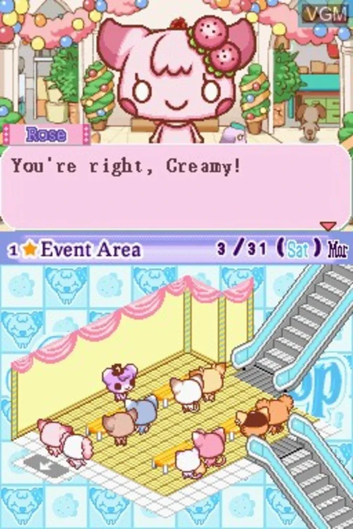 Create a custom dessert shop to satisfy the sweet teeth of little dogs and cats in this whimsical business management game for Nintendo DS. You'll help Rose, your dog, oversee the business, making decisions such as which ingredients to purchase, the store's decor and layout, and the right recipes with which to make the most money. More than 45 mini-games are included, allowing you to make ice cream, cut cakes, and perform other shop-related tasks. Interact with 22 characters, choose from more than 50 articles of clothing, and participate in 150 events in your quest to become the most successful shop in Sweet City.