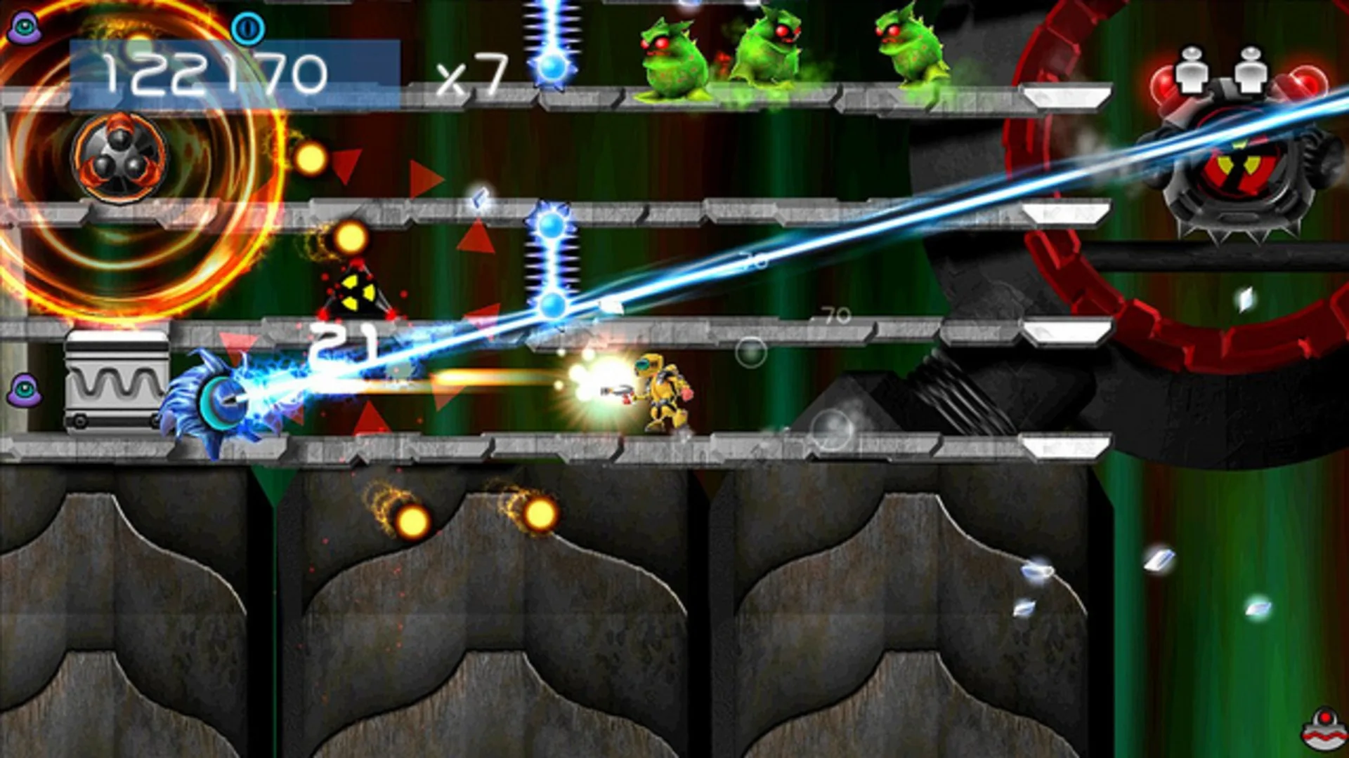 Alien Zombie Megadeath is a gloriously intense platform shoot-em-up! You are the lone Spaceman, doing boring space work on a random space platform in deep space when suddenly a huge, relentless, alien force attacks! However these are not your normal everyday aliens...these are alien ZOMBIES! Even through his protective helmet, Spaceman is sickend by their smelliness. For the sake of humanity... and Spacemans nostrils... you must take control of the ill-fated Spaceman and fend off the alien zombie hoards. Alien Zombie Megadeath is an oldschool 2D platform shoot-em-up with enemies coming at you from all sides, in all shapes and sizes. You MUST blast them all to smithereens.
