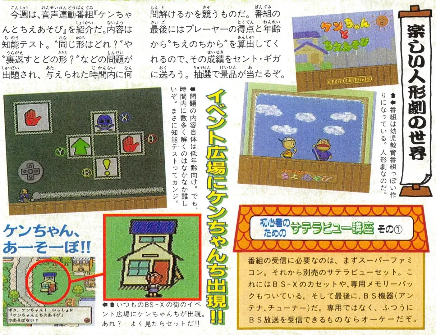 Ken-chan to Chie Asobi is a SoundLink game released for the Satellaview. It is a game in which Ken and his sister Yo-chan solve an intelligence test quiz. In the meantime, it seems that a puppet show with songs and voices was broadcast.