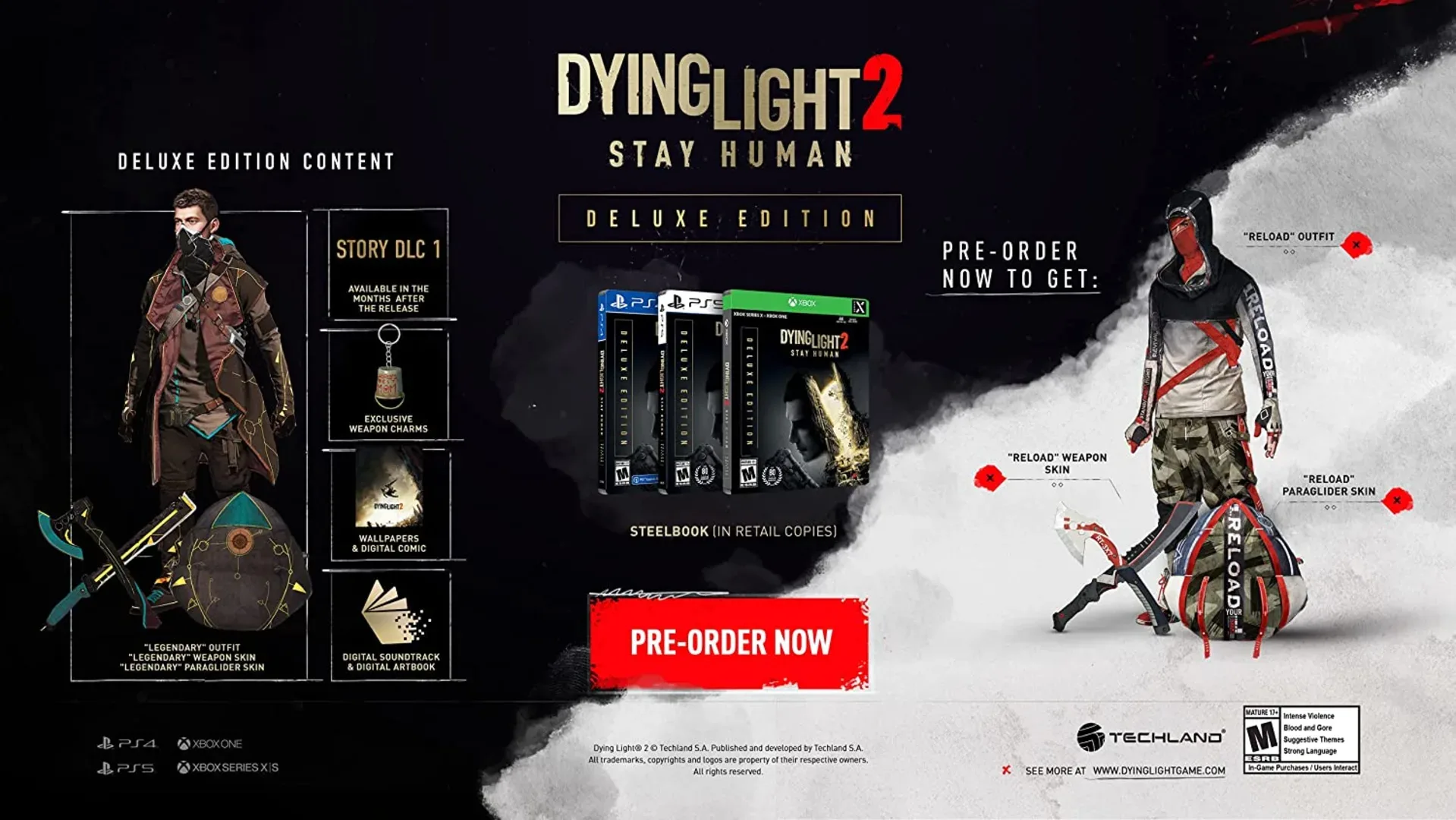 Dying Light 2: Stay Human - Deluxe Edition includes: - Dying Light 2 Stay Human - Access to a story DLC - Exclusive weapon charms - Legendary Skins Pack - Wallpapers ready to print - Digital comic & Artbook & Soundtrack