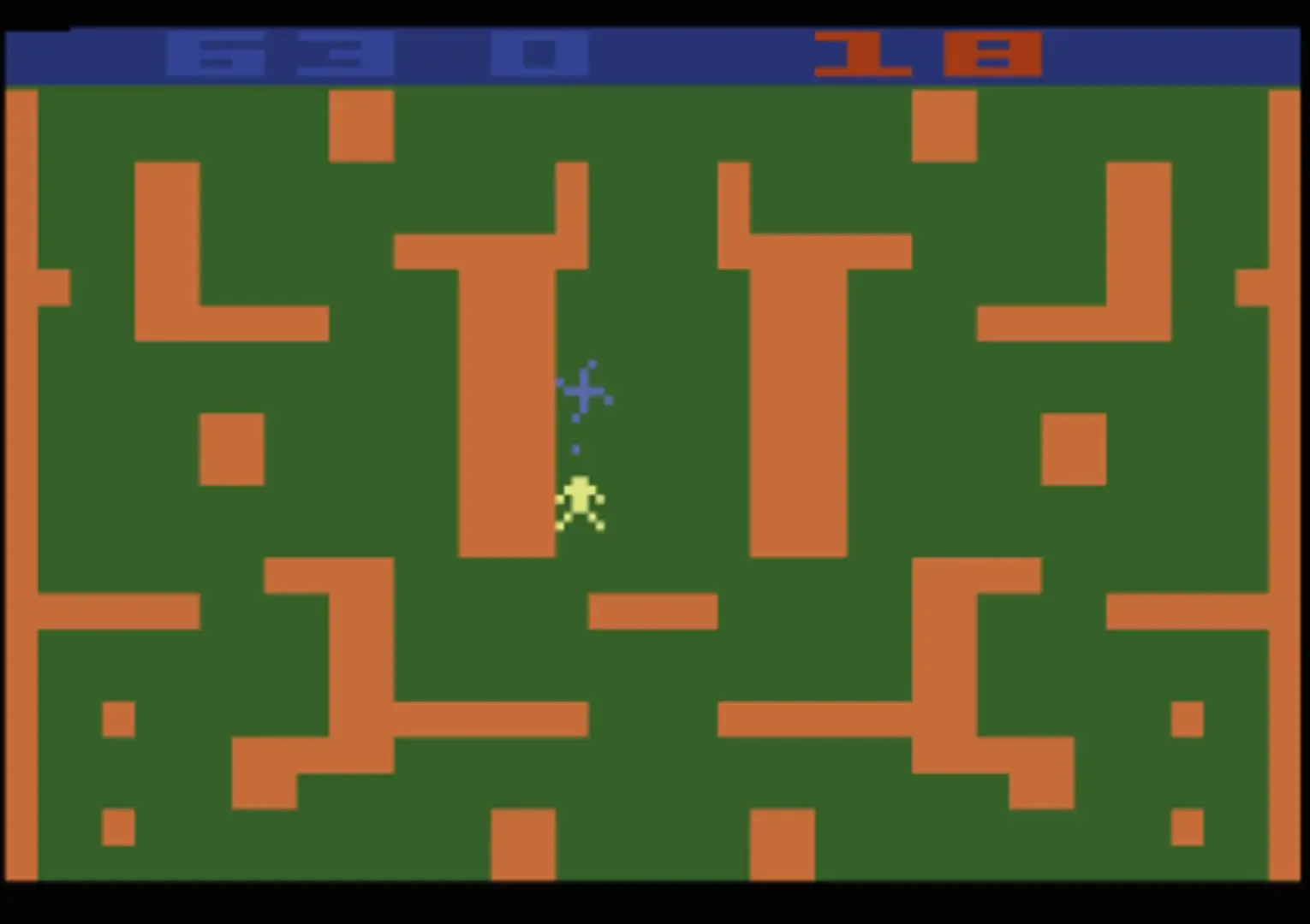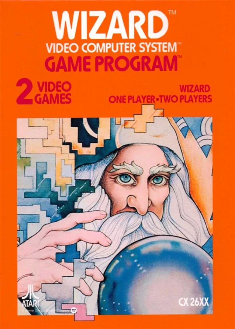 Wizard was to be the last of Atari's 2600 games, but went unreleased in favor of the new 5200 games. Chris Crawford puts it this way: "Wizard was spec'd as a 2K game, but just four months later, when it was ready, the marketing people had decided that everything should be 4K, so they asked me if I could expand it to 4K. To be honest, I really didn't want to work on the 2600 -- I was eager to get going on the 800. So I told them that you don't just expand a 2K game to 4K: you start from scratch and design it for 4K from the ground up. That was true, and marketing lost interest, so I got to move to the 800." Since Wizard was never advertised in any Atari catalogs and it was never assigned a part number, most people don't even know if its existence. Wizard can best be described as a cross between Berzerk and Wizard of Wor. You control a wizard (at least I think he's a wizard), who must attempt to destroy the swirling star shaped creature. The board layout is a giant maze, which makes it hard to run from the creature and to get a clean shot off. Unfortunately the creature can move through the maze walls, but thankfully it can't shoot through them. Once you take a shot you'll notice that your wizard dims a bit, this means you are recharging, and cannot shoot. Once your wizard is done recharging he will light back up again, and you can take another shot. You don't have to worry about aiming you shots, as you will automatically shoot in the direction of the creature. This makes it easy to run away but still take shots at the creature.