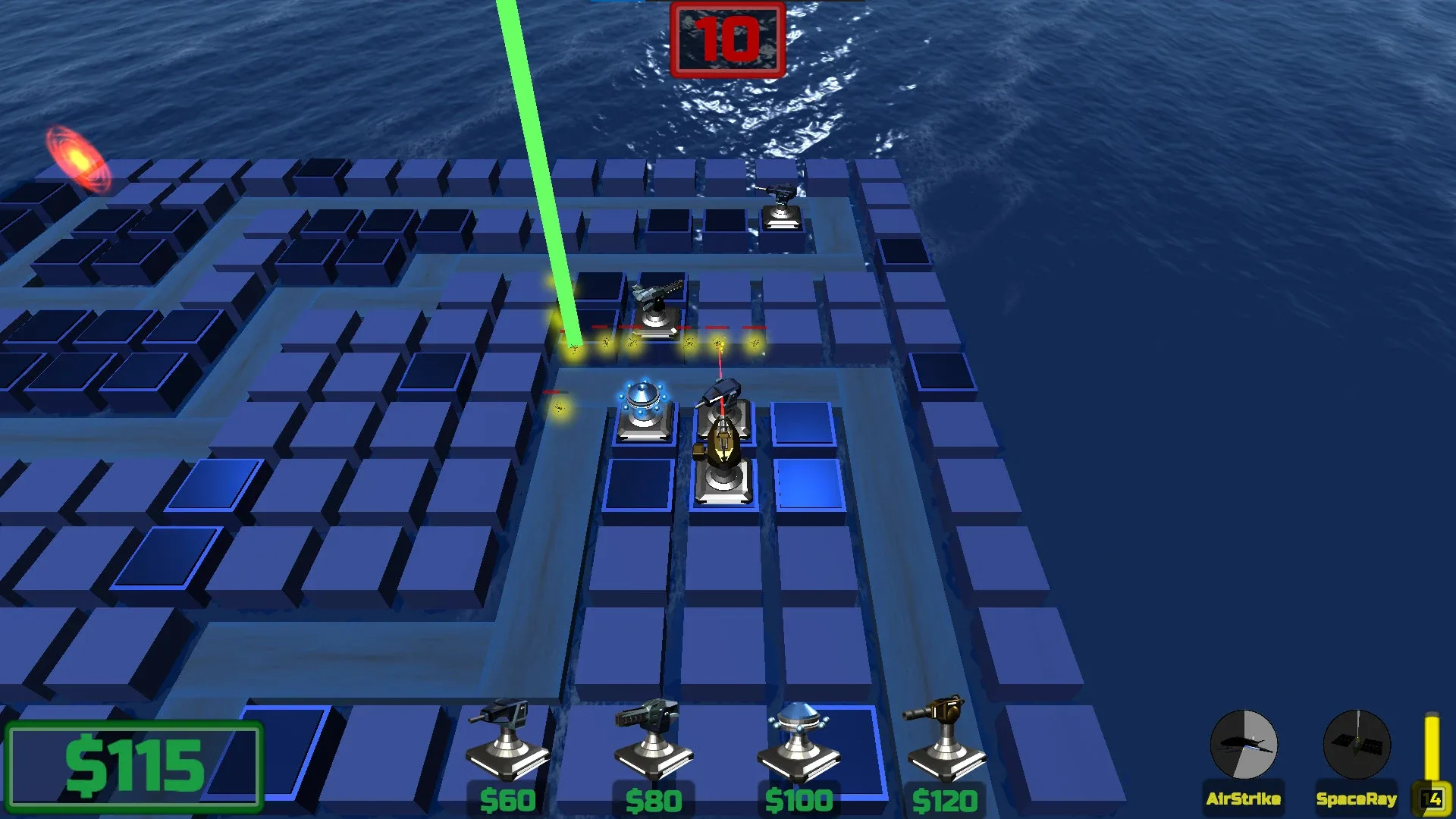 Place lasers, missile launchers, sniper turrets, and use combat strategies such as airstrikes and the space ray to repel waves of alien invaders in this sci-fi tower defense game.