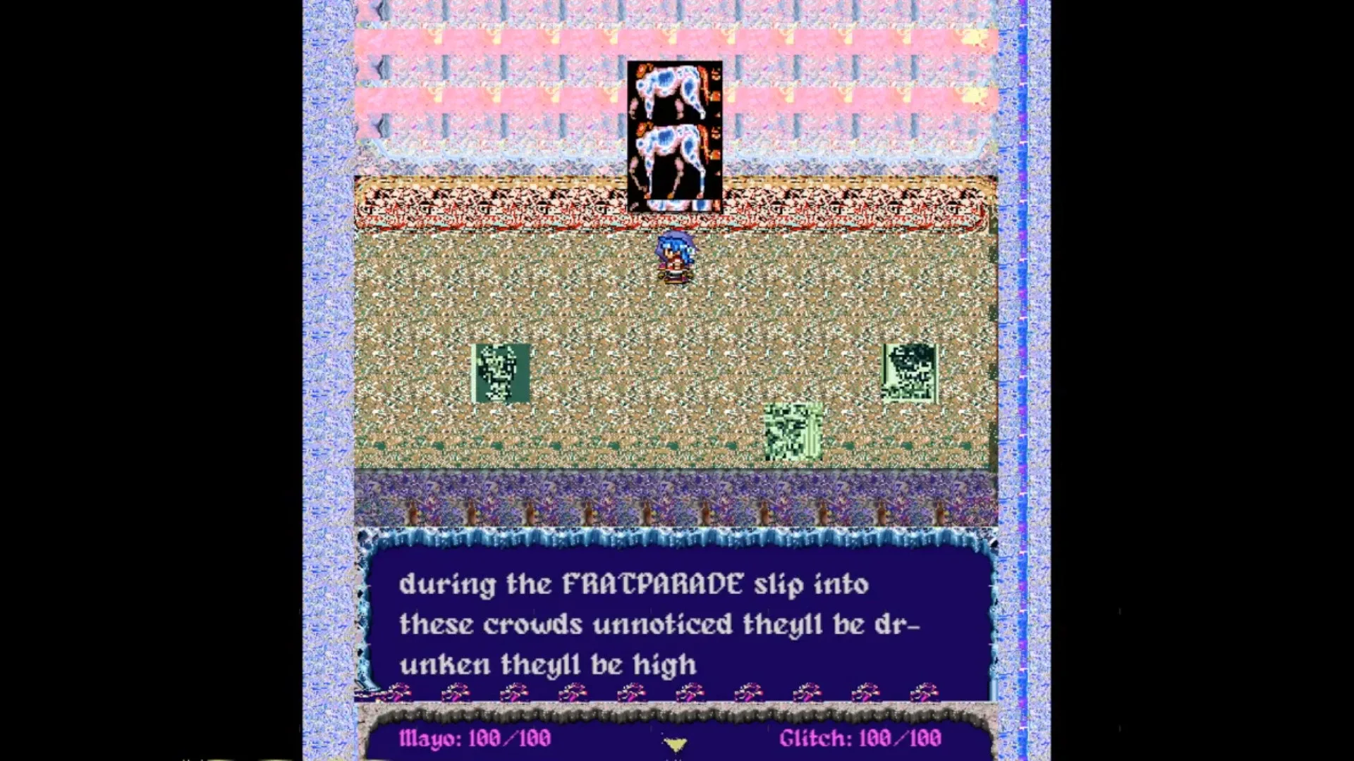 A new RPG found in this flaming dumpster: undo this curse of toxic masculinity upon yr college campus through the power of glitches.