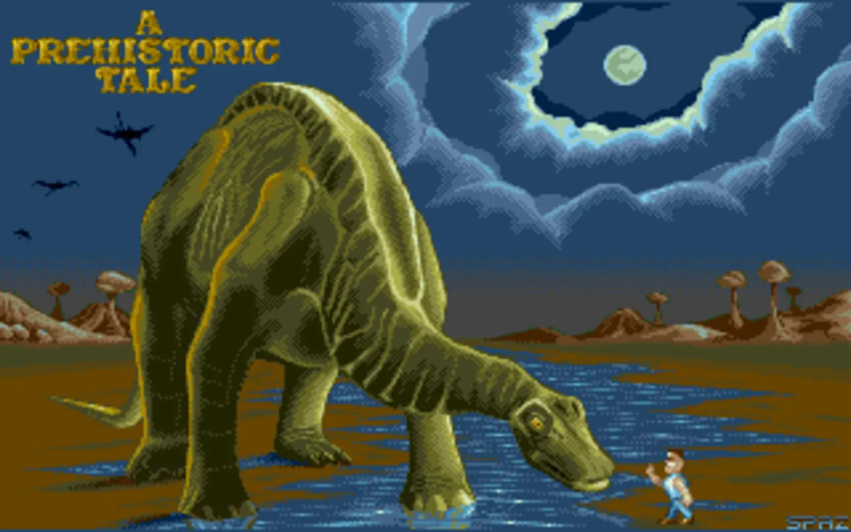 A Prehistoric Tale is a non-scrolling 2-D platformer. Kill enemies by jumping on them. Alternately, hatched dinosaurs can be temporarily caged by jumping over them. This game is essentially a remake of Dino Eggs for the Commodore 64.