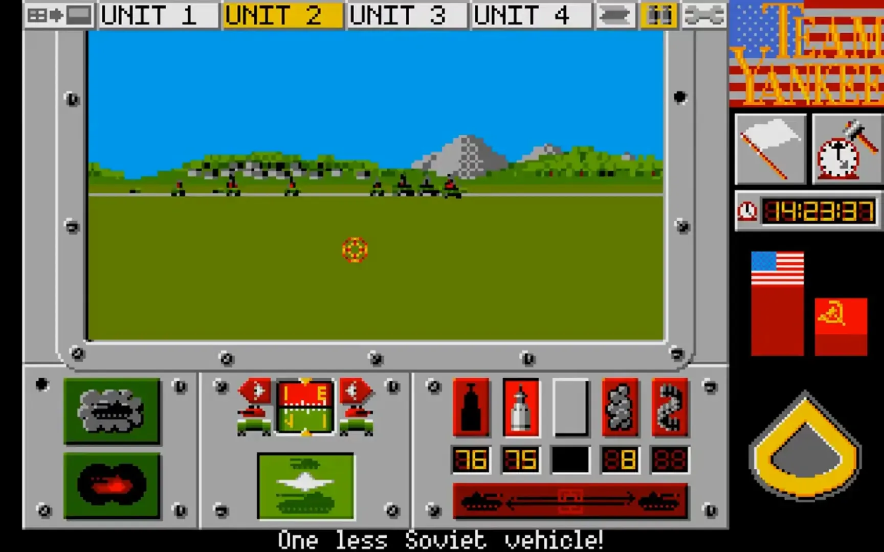 In this tank simulation game based on Harold Coyle's book of the same name, Team Yankee is a squad of crack tank drivers and gunners. They are in the latest tanks, such as the well known Abrams M1, Bradley M2, T-72 and T-62, armed with lasers, machine guns and SABOTs. As Commander Sean Bannon, you must use these resources correctly in five missions ranging from defending a hill to attacking a centre through a forest.