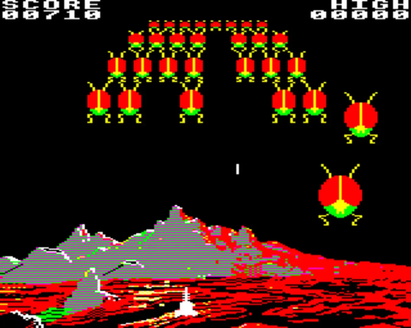 Attack on Alpha Centauri is a fixed screen shooter similar to Galaxian. The player moves his spacecraft left and right along the bottom of the screen while shooting at the rows of wasps above him.