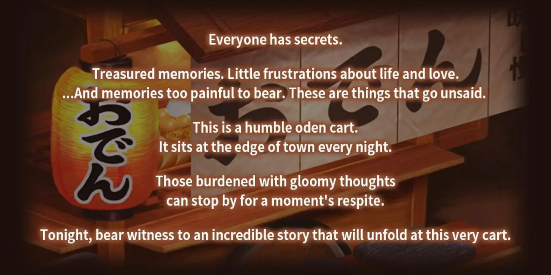The strangely moving tale of a small oden cart on the edge of a quiet town. Take on the role of an old man managing his oden cart in this relaxing, story-driven game. The customers who frequent your cart all have a few...quirks. Help your customers blow off steam by listening to their gripes about everyday life. Their rich, complex stories unfold with each new gripe. Yes, believe it or not, their casual complaints reveal a moving story with a surprising twist! Tonight, you'll witness something special.