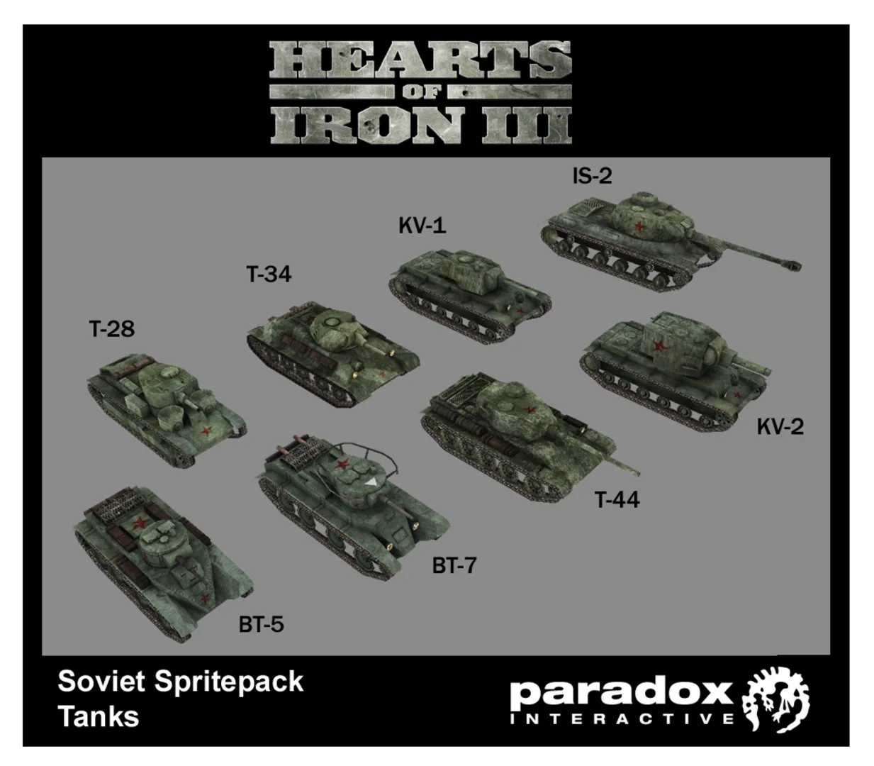 The Soviet spritepack adds 16 more Soviet sprites in the game. 8 New Tanks: BT-5 BT-7 T-28 T-34 T-44 KV-1 KV-2 IS-2 5 New Aircraft: Mig-3 Mig-9 Lagg-3 Yak-4 Sukhoi SU-2 3 New Ships: Gangut-class Battleship Kirov-class Heavy Cruiser Leningrad-class Destroyer