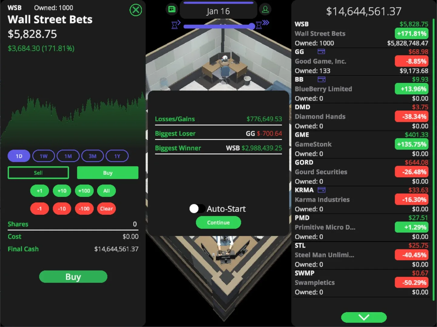 Wall Street Bets is a comical simulation stock market game. Will you be the trader to break $100,000,000 or go bust? Remember: Always buy the dip.
