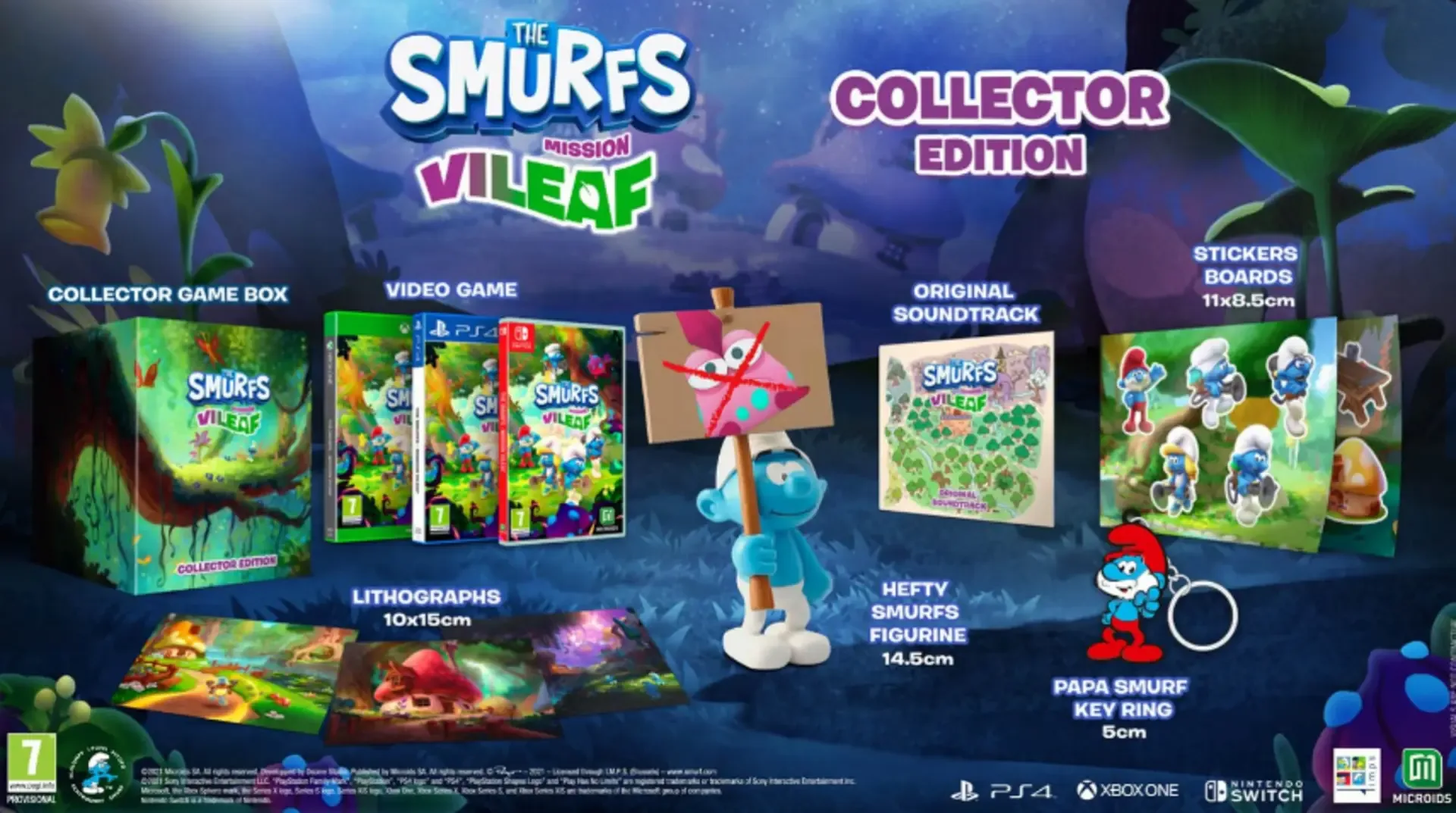 The Collector's Edition contains: - The main game - 3 lithographs (10x15cm) - A Papa Smurf keychain (5cm) - Sticker sheets (11×8,5cm) - A resin Hefty Smurf figurine (14.5cm) - The game soundtrack (digitally claimable with a code)