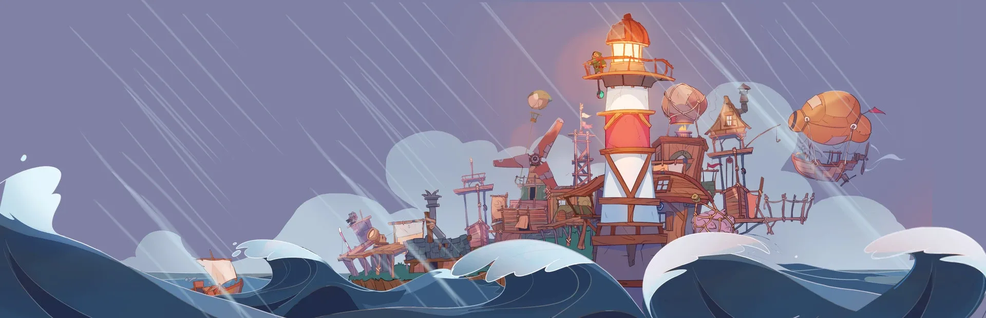 Diluvian Winds is a management game set in a small hamlet at the foot of a lighthouse. Welcome weary travelers and help each other to try and survive the unpredictable weather. Grow your hamlet on land, under the sea or among the clouds.