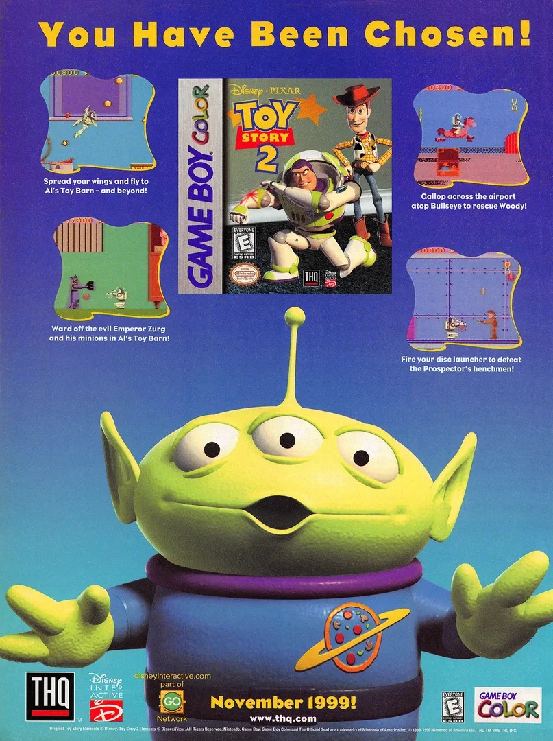 The Game Boy Color version is a side-scrolling platform game unrelated to the other versions. The player controls Buzz, who can jump, run, and shoot his laser at enemies. It features 11 levels, including two bonus levels that can be accessed if the player collects all the coins located in certain levels. Because the Game Boy Color has only two action buttons, Buzz's running and jumping are both done through the B button. While standing motionless, the player can jump and move across gaps, whereas running is initiated by pressing the B button while moving. Gameplay is saved through a password feature