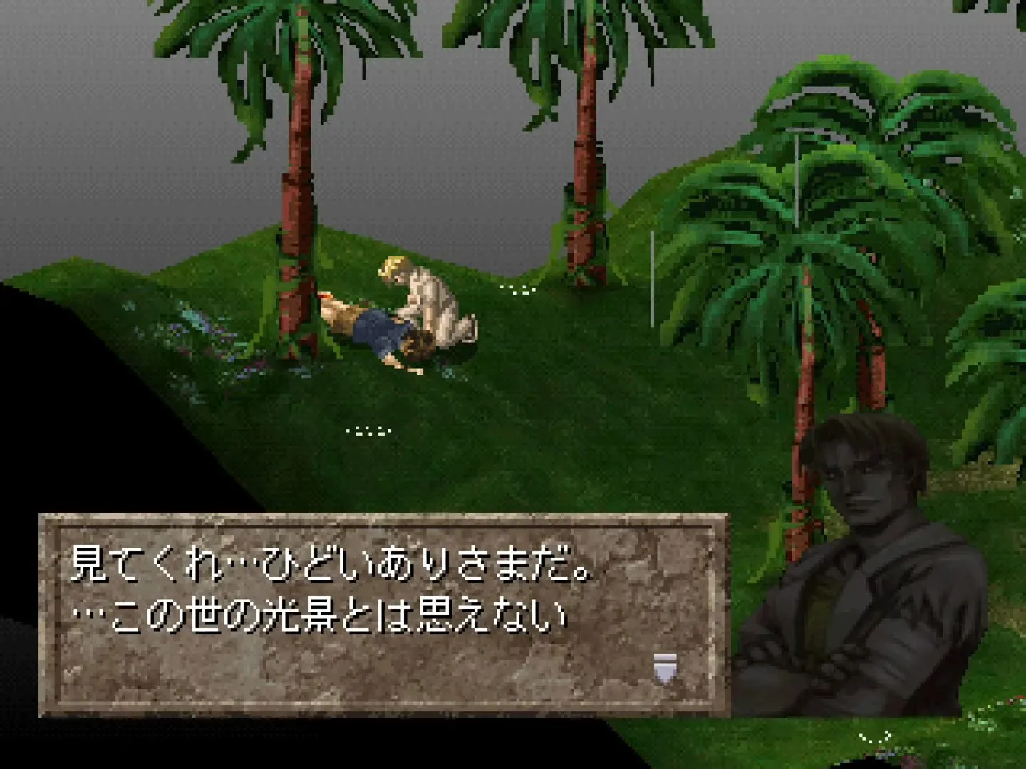 Ningyo no Rakuin is a tactical horror RPG inspired by the works of Howard Phillips Lovecraft. Between the fanatical quasi-human tribesmen, the Deep Ones rising from beneath the waves, and the grad student from Miskatonic University, there are more references to the Mythos than you can shake a shoggoth at. The plot itself is fast-paced, centering first on surviving the dangers of the island and later on rescuing the main character's girlfriend from a particularly nasty fate involving an unnamed Elder God and a transformation into a fishy abomination. Elements of the storyline play out before and after (and sometimes during) each battle, and the interludes between battle chapters include a short summary of recent events leading up to the current plot point.
