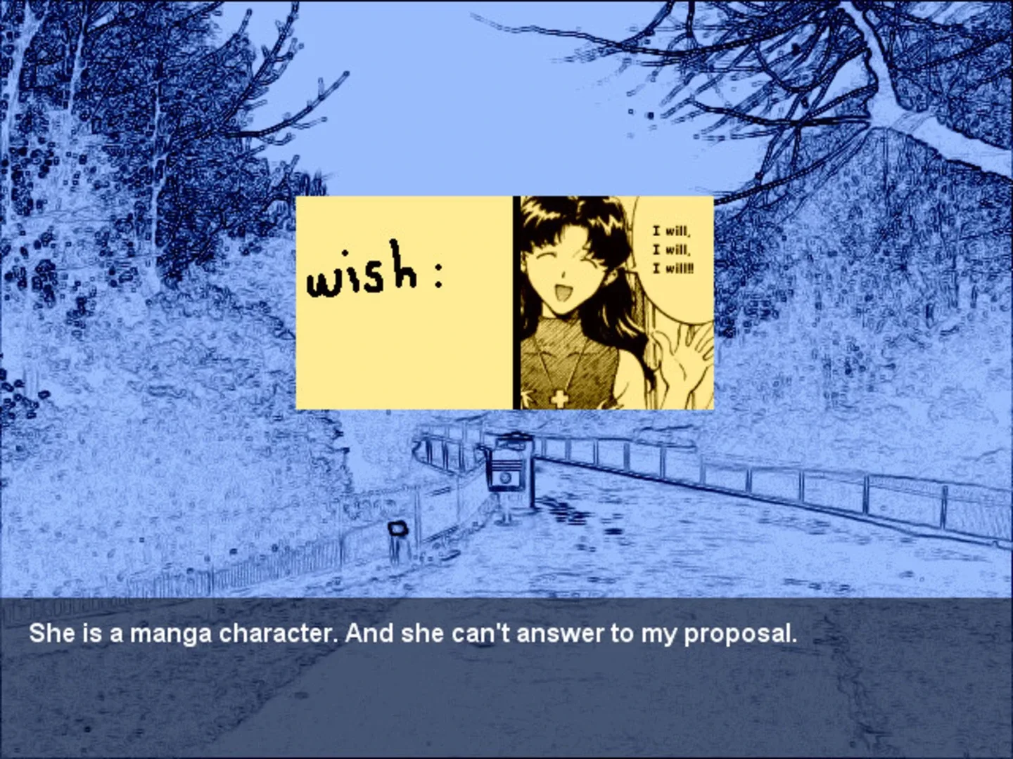 You are the hero, whose only love is Misato decides to marry her. But it's obvious - she is an anime character, how can you marry her then? However, your love is so strong... And you have a plan...