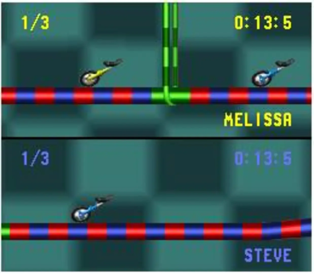 What do you get if you cross Sonic the Hedgehog with Tony Hawk's Pro Skater? It might seem an odd combination, but it describes Uniracers perfectly. One of the more successful releases of the Super Nintendo's twilight era, Uniracers mixes platform-based high-speed racing, with crazy stunts and tricks. The basic idea in most levels of the game is simple. Get your unicycle from A to B as quickly as possible, and finish ahead of your opponent. It's like Sonic, but with none of those pesky enemies, pointless power-ups and frustrating obstructions. In fact it doesn't sound like much of a game at all... Here's the key, though. Tricks performed and landed during the race increase your speed. The better the trick, the greater your increase in speed will be. Also, some levels are set in areas designed solely for stunts. Such levels require you to earn as many style points as possible, by doing tricks. These levels are against the clock, and a set points score, rather than an opponent. Unicycles are stupid and difficult, and yet fun, once you get the hang of them. Much the same could be said about Uniracers...