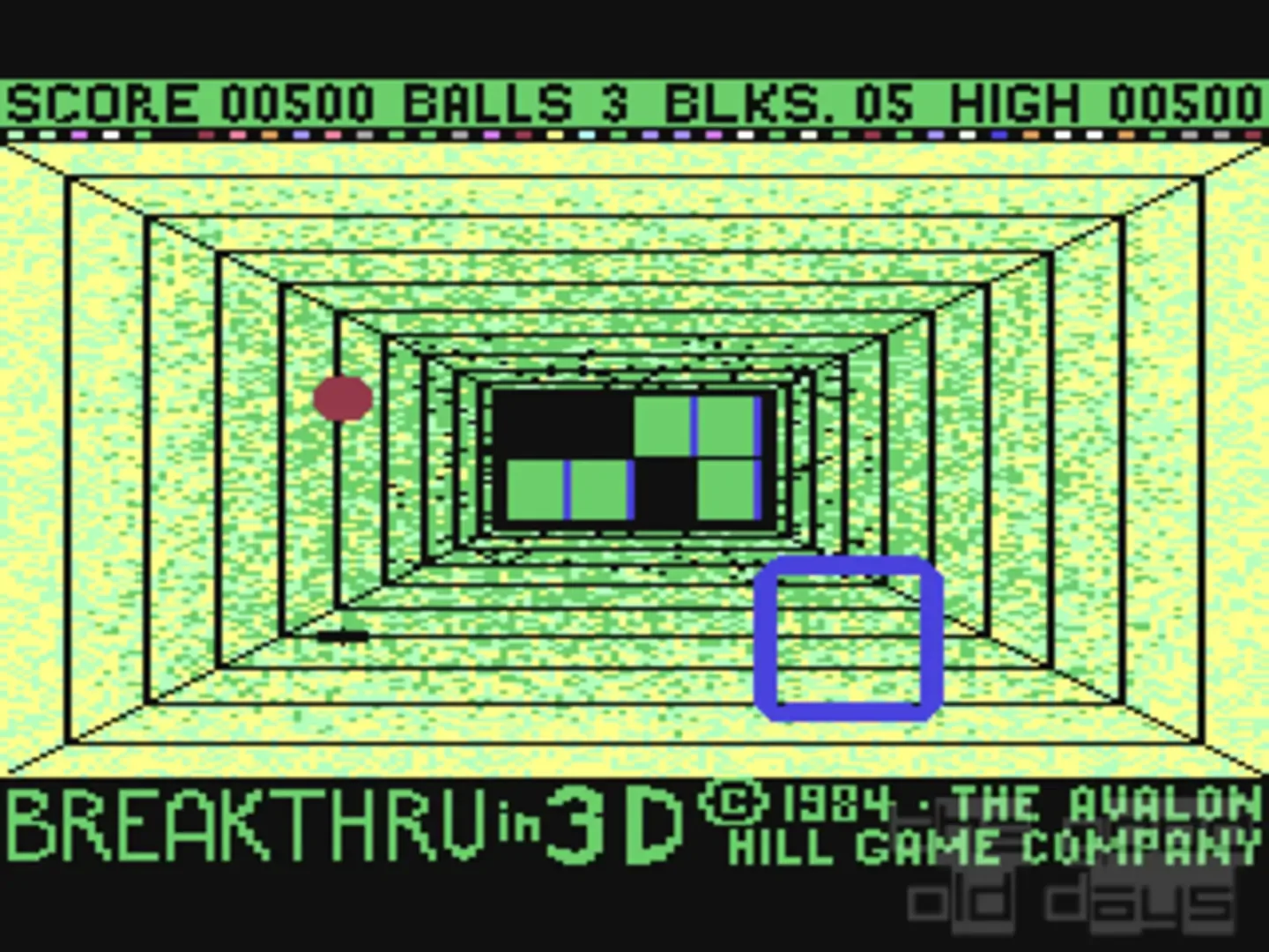 BREAKTHRU is a fast-action, 3-dimenional, high-res graphics, machine-language arcade game for the Commodore 64©. More than just a game, realistic sounds and graohics are use to give a very exciting simulation of motion and perspective in 3-D space. It's as much fun to watch as it is to play. The object of the game is to knock out successive walls at the opposite end of the (racquetball) court using a joystick-controlled paddle to strike or deflect the bouncing ball.